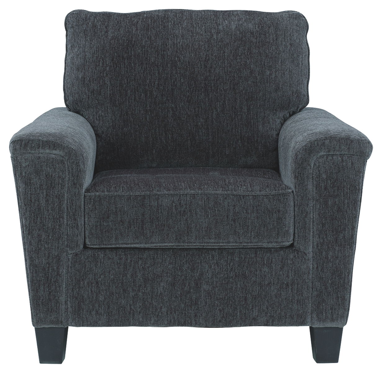 Covered in an upholstery loaded with plush texture, this less-is-more contemporary chair is dressed to impress with angled side profiling and track armrests wrapped with a layer of pillowy softness for that little something extra. Talk about one sensational look.