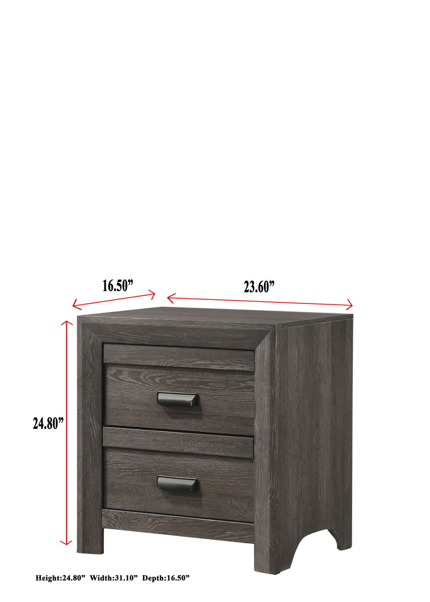 This bedroom set is the embodiment of understated sophistication, featuring a neutral finish that complements its clean and contemporary design. The robust bed frame anchors the room with a sense of sturdiness and style. Accompanying the bed are coordinating pieces: a dresser with a large mirror, a tall chest for additional storage, and a nightstand to keep essentials within reach. Each piece is crafted with sleek, straight lines and fitted with rectangular cup pulls, creating a cohesive look that’s both modern and timeless.