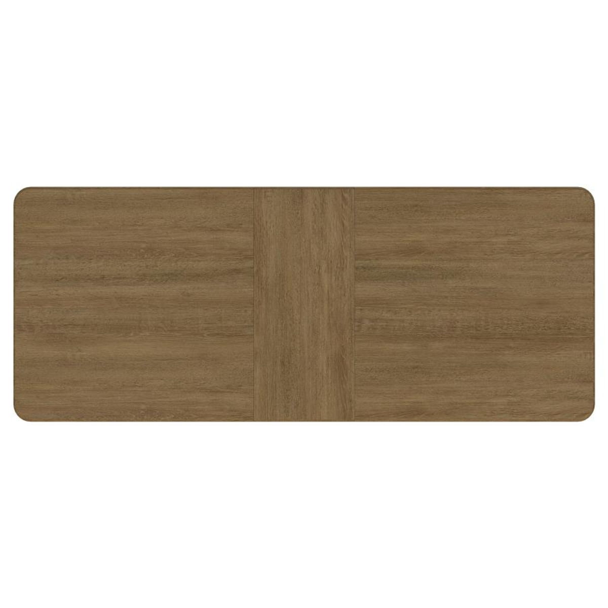 This dining set blends modern craftsmanship with natural textures for a refined yet inviting feel. The dining table features a trestle base with an antique brass-finished metal stretcher bar, adding stability and contrast. Rounded corners soften the rectangular top, while a removable 18-inch leaf allows for flexible seating. The dining chairs feature handwoven cane backrests, solid wood frames, and Pirelli webbed seat cushions upholstered in beige linen-like fabric for lasting comfort and support. A wood grain finish enhances the natural beauty of the materials.
