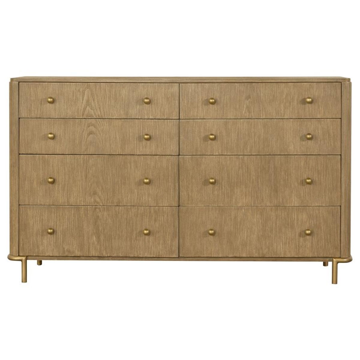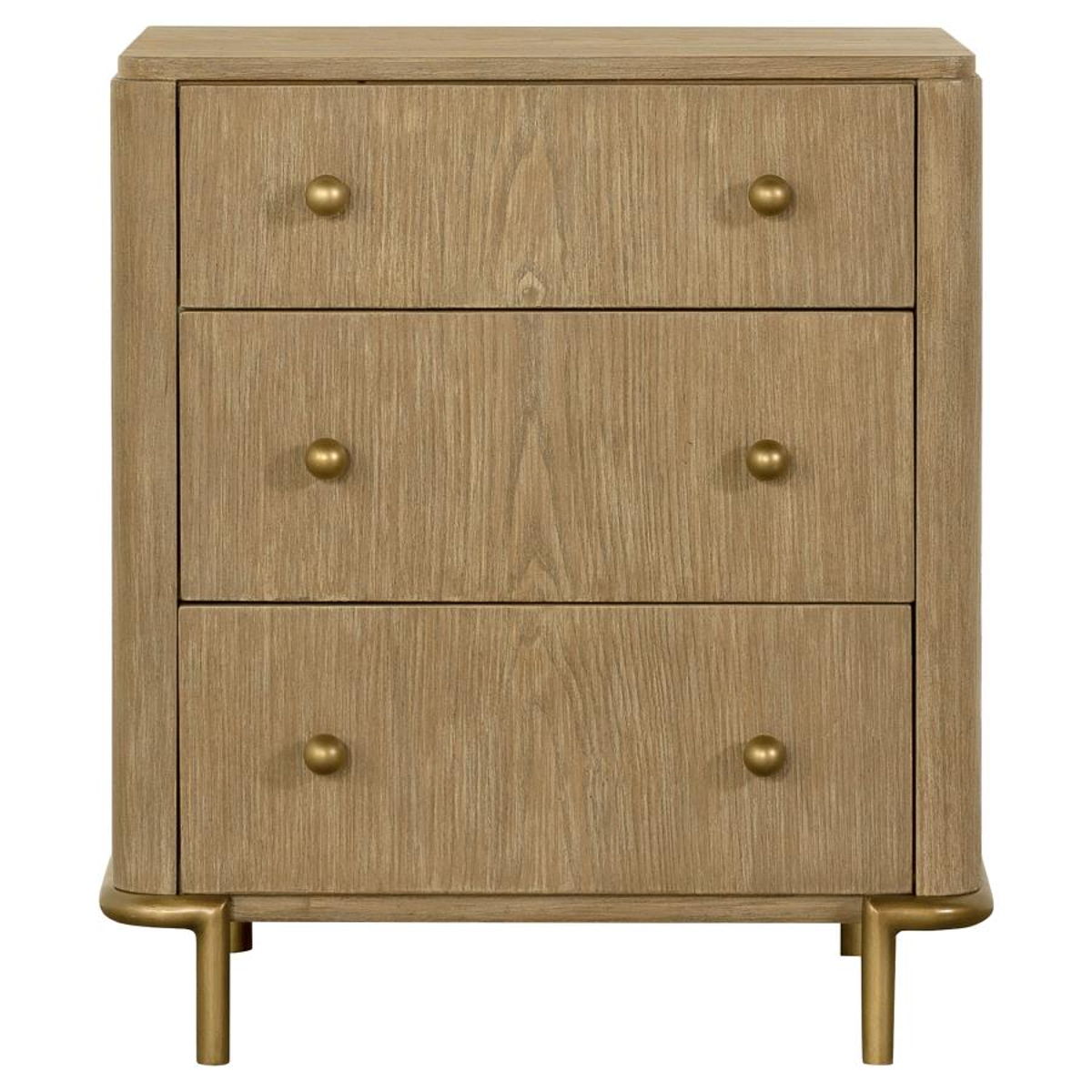 This coastal-inspired bedroom set blends mid-century modern influences with natural textures for a serene retreat. The bed features a fabric upholstered headboard and footboard, framed by a wire-brushed wood finish that enhances the beauty of rubberwood, engineered wood, and ash veneer. Aged brass knobs and slender metal legs provide a refined contrast. Designed for modern living, the nightstand includes a built-in dual USB charging port. With its organic textures and functional details, this set offers timeless style and everyday convenience.