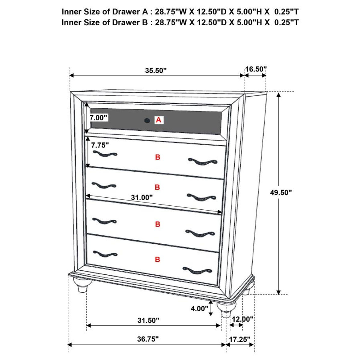 - * Drawer – felt lined: Yes, top drawer only