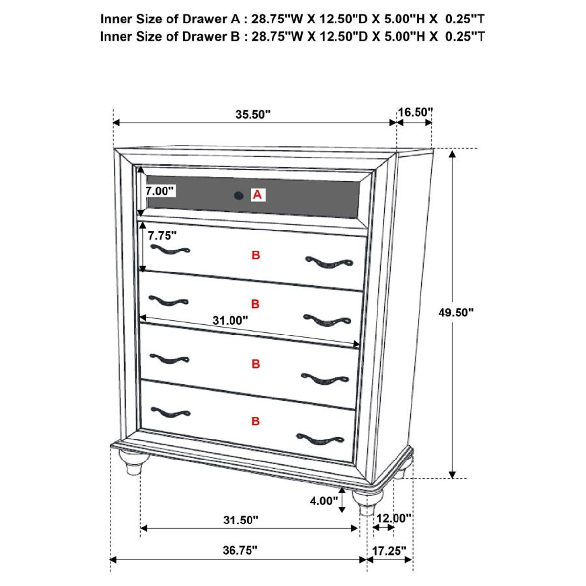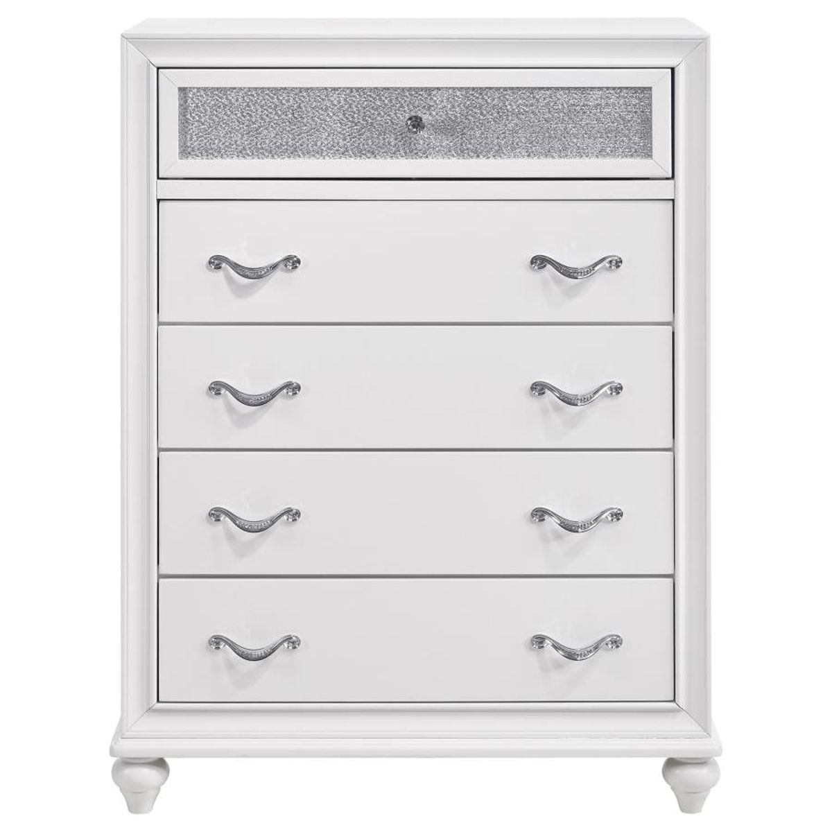Get ready to add exquisite glamour to your space with this upholstered bedroom set. The dramatic headboard offers incredible contemporary appeal with velvet upholstery, button tufting, crystal-like accents and hand-applied nailhead trim with a chrome finish. The matching nightstand comes equipped with a crocodile textured door panel and a glimmery chrome top drawer panel. The seven-drawer dresser with mirror and optional five-drawer chest offers the same texture and sparkly finish. Sleek chrome bar pulls perfectly complement the tapered legs on the panel bed and the bun style feet for the storage pieces.