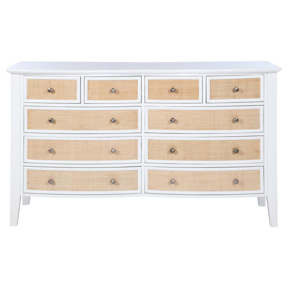 Play up approachable coastal character with a modern ten-drawer dresser in your bedroom. It shows off a gently double convex curved profile, complemented perfectly with a bright white finish that lends casual elegance. Each drawer front is adorned with natural rattan that offers the perfect dose of texture and character. Petite round knobs complete the look to perfection. Abundant drawers include four smaller felt-lined top drawers and six larger lower drawers, creating a perfect blend of storage for clothing, accessories, and personal effects.