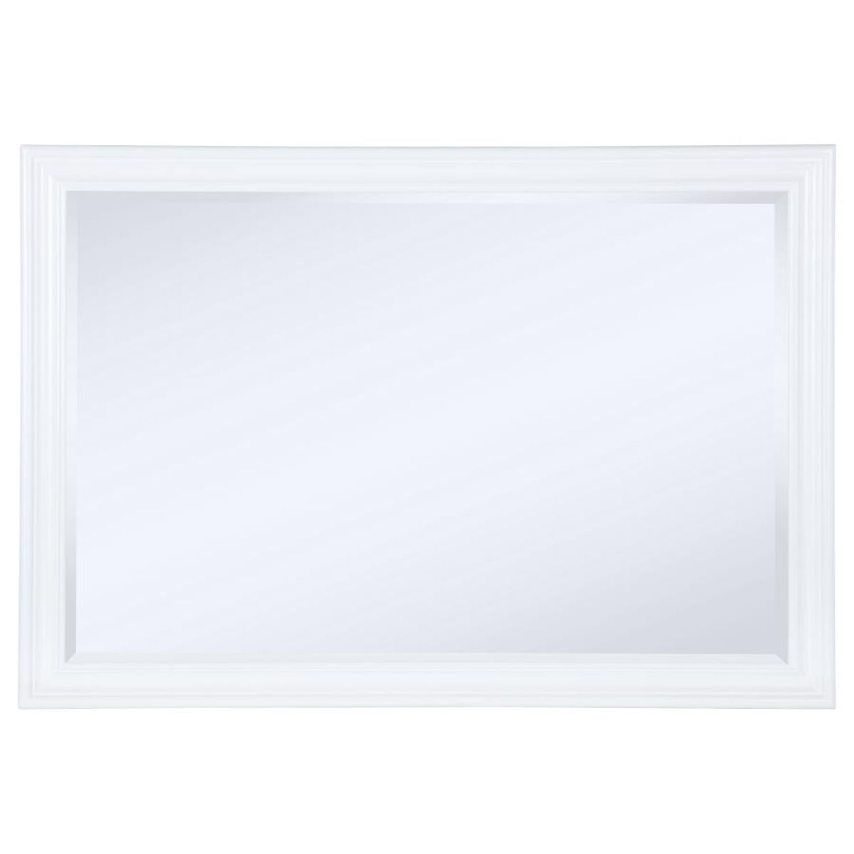 Textured rattan drawer fronts create a fresh, modern coastal aesthetic for this contemporary bedroom set. Offering ample storage and a clean look and feel, the set centers on a wooden bed with a gently flared, upholstered headboard with plush foam padding for easy comfort. The set includes a bright finish, offering easy contrast to the rattan and linen-colored fabric upholstery that creates cool ambiance. Top drawers in the set include black felt lining and drawers are dotted with round metal knobs. The dresser includes a framed mirror while the nightstand offers both a drawer and a shelf for easy storage and decor.