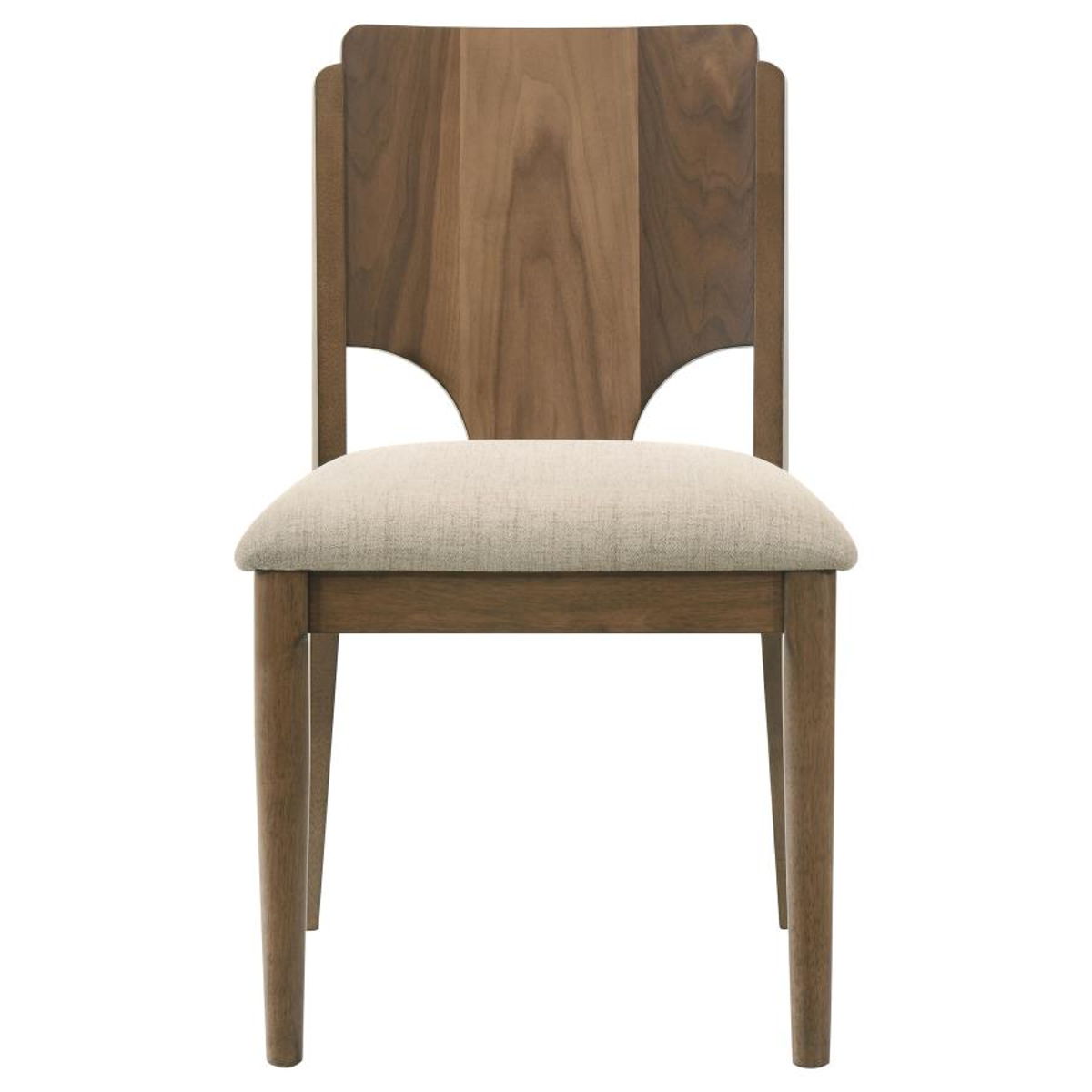 Accentuate the inviting style of your kitchen or dining room with a modern dining set. It offers fresh, contemporary flair with a walnut wood grain finish paired with beige upholstery on its chairs. The table features a trestle base and round post legs, offering casual ambiance for a welcoming home. Chairs are designed with wooden back and wedge details that add movement and character. Foam seat cushions are upholstered in beige fabric, offering neutral contrast and providing exceptional comfort and support for delicious meals.