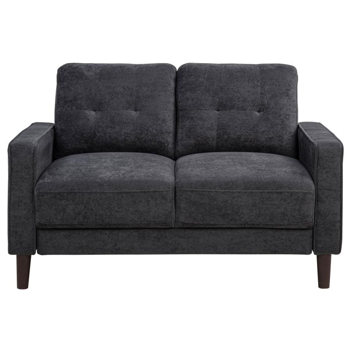 Designed for smaller spaces without sacrificing comfort, this modern loveseat blends refined lines with cozy charm. Slim track arms trimmed in cord welt frame grid-tufted back cushions for a tailored touch, while pocket coil seating offers lasting support. Wrapped in softly textured upholstery and lifted on tapered legs, it brings ease and structure to studio apartments, reading corners, or compact living rooms.