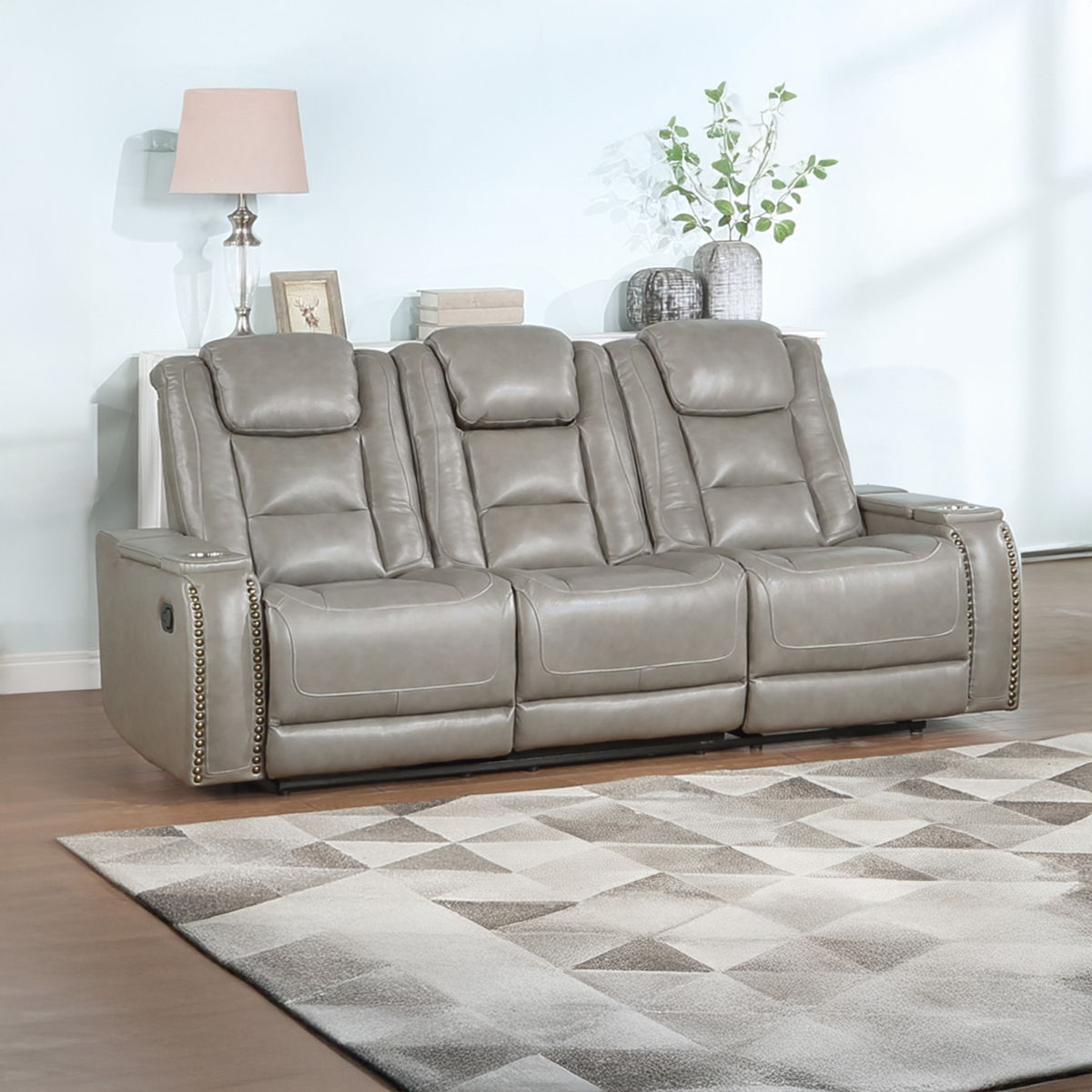 The Breckenridge Genuine Leather Reclining Sofa offers a perfect combination of luxury, durability, and modern convenience, making it an ideal centerpiece for your living space. This reclining sofa is crafted with a blend of hardwood and manufactured woods, ensuring a sturdy and durable frame that provides long-lasting support and reliability. The top-grain leather on the seats, arms, and footrests delivers a luxurious feel, while a matching leather-like material in less-touched areas keeps it affordable without compromising on style or comfort. The design features clean lines and elegant nailhead trim, blending traditional and contemporary elements for a refined, transitional look. Pocket coil seat cushions provide superior comfort with targeted support, minimizing pressure points for a tailored seating experience. The reclining seats allow you to easily find your perfect position for lounging or reading. This sofa is also packed with convenient features, including cupholders integrated into the armrests. Additionally, the sofa includes a drop-down tray, electrical outlets, and reading lights, making it a functional and stylish addition to any home.