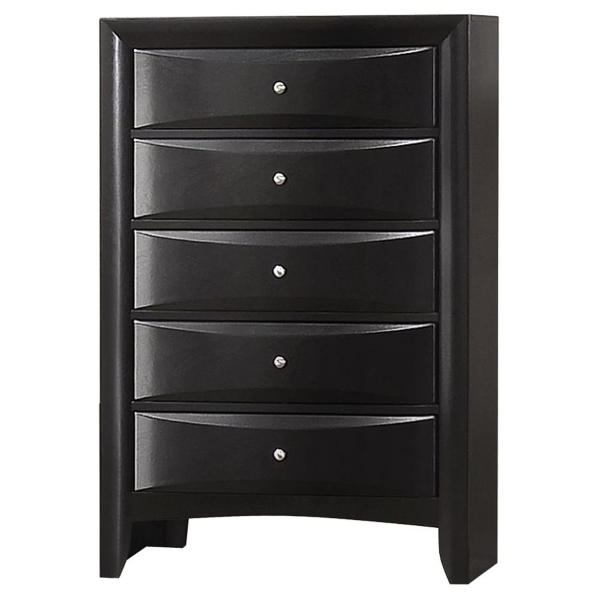 Keep your bedroom organized with this five-drawer chest that blends transitional style and practical design. Finished in a sleek black tone, it features chambered drawer fronts for a sculpted, dimensional look accented by brushed nickel hardware. The spacious drawers glide smoothly, providing ample storage for clothing, linens, and accessories. Built from rubberwood, engineered wood, and okume veneer, this durable chest brings lasting quality and refined simplicity to any bedroom setting.