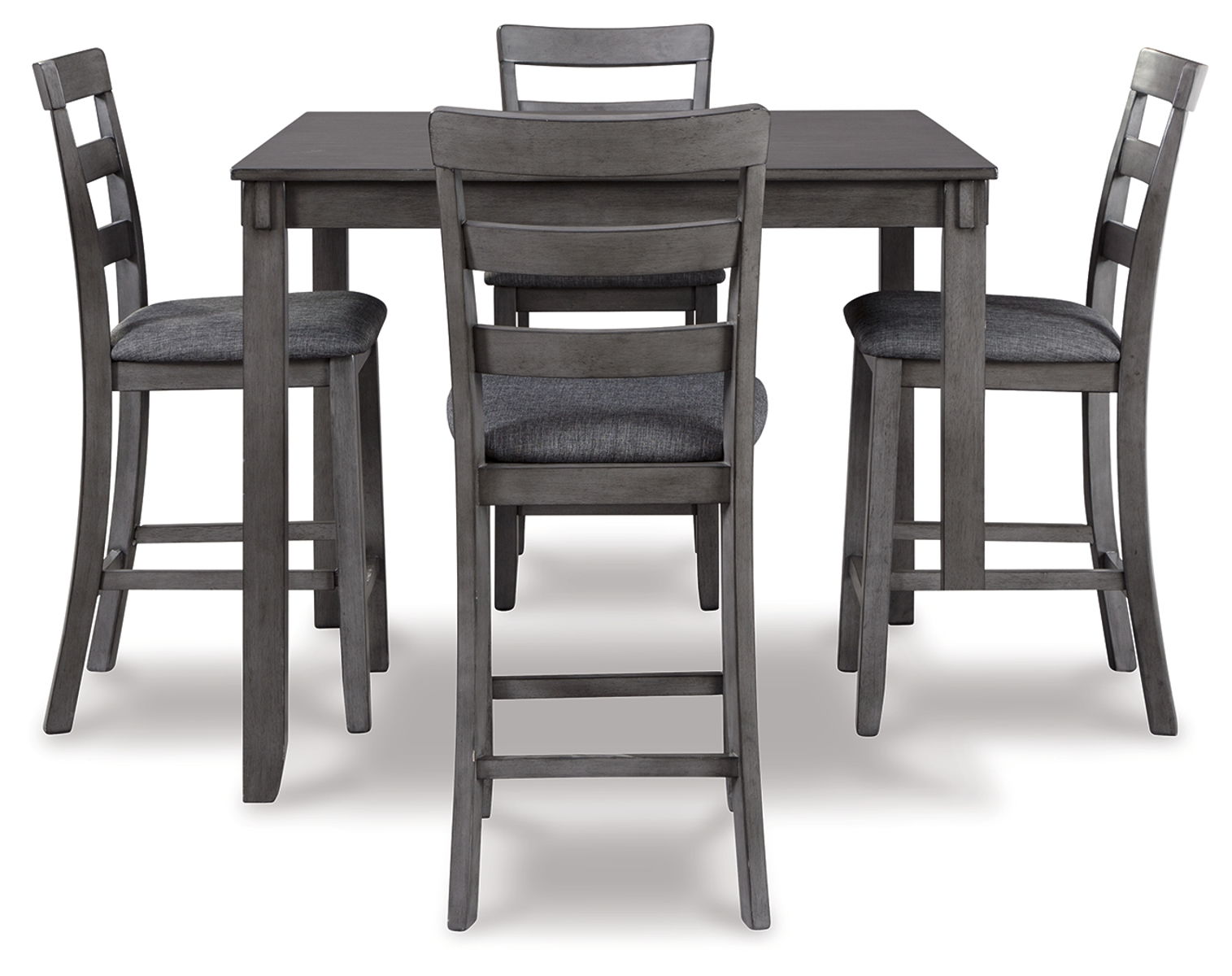 It’s so easy being gray—at least this 5-piece dining set makes it seem that way. This transitional counter-height table and barstool ensemble sports a charcoal gray finish with textured gray upholstery for an on-trend and relevant appeal. Plushly upholstered seat cushion in a practical polyfiber makes it a pleasure to linger at the table. Best of all, square table design is ideally suited for small spaces.