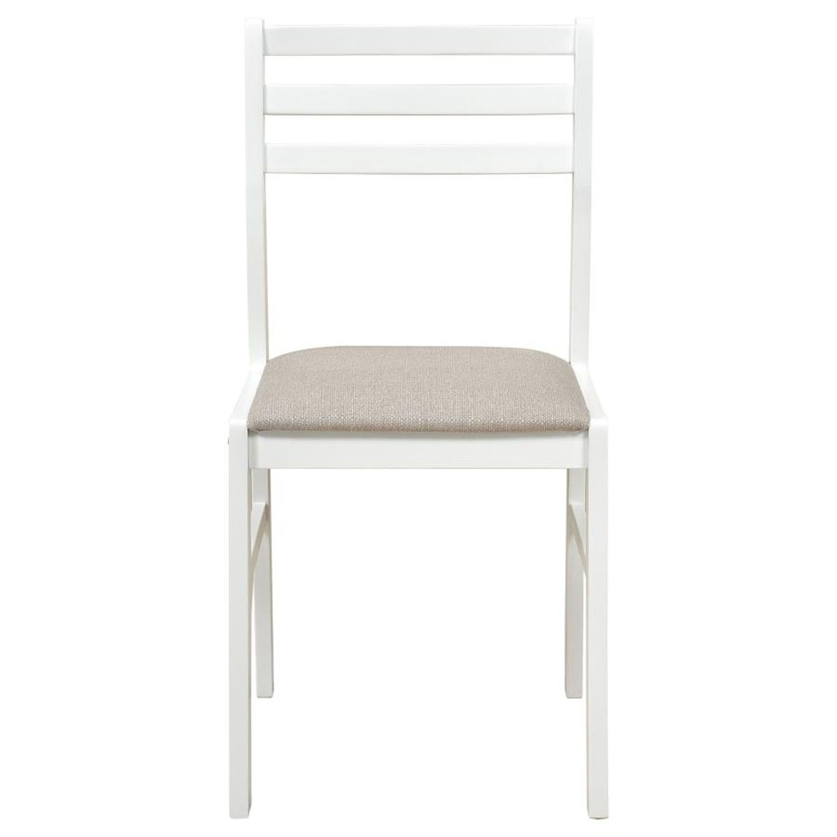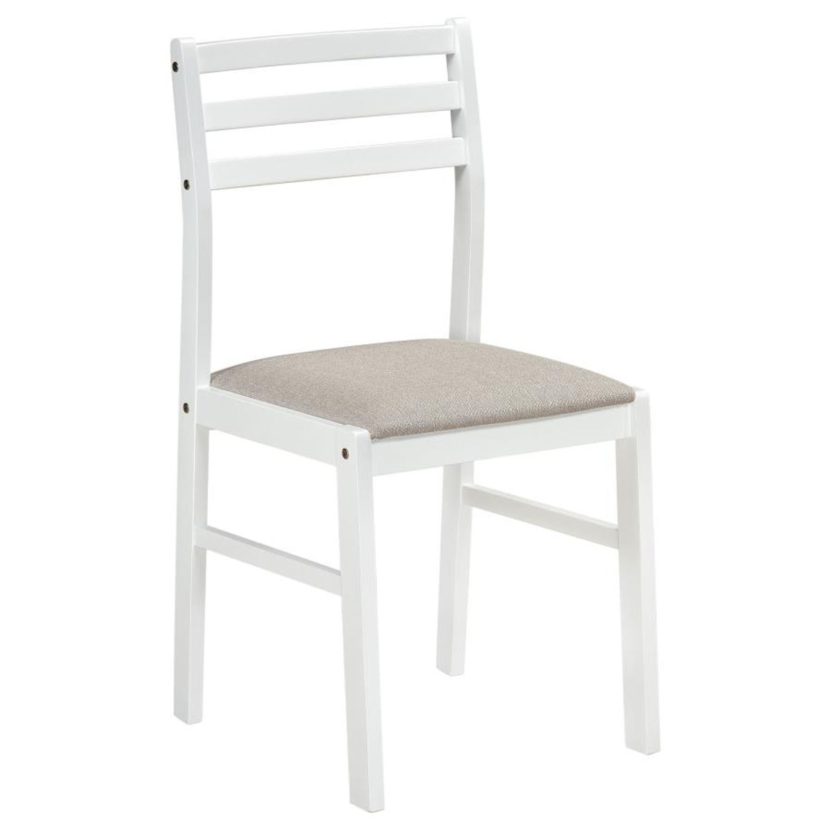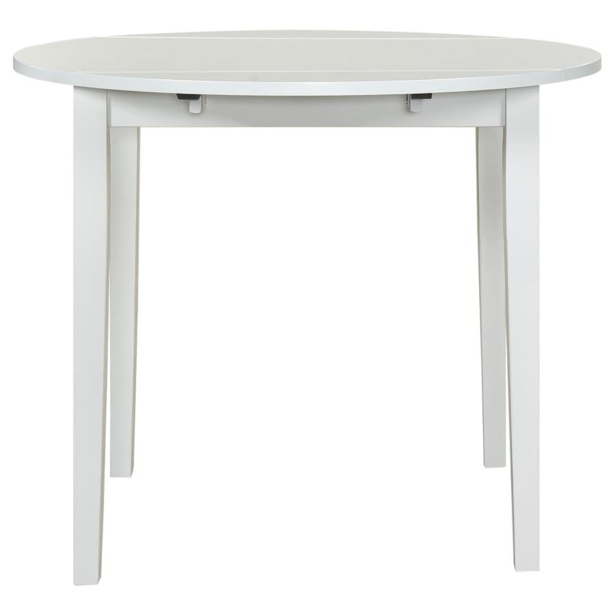 This charming three-piece dining set brings effortless grace to small-space dining. The round table features dual drop leaves, gracefully adapting to your needs with a soft, white finish that brightens any corner. Ladder-back chairs with gently cushioned microfiber seats in warm beige offer comfort and understated elegance. Crafted from solid rubberwood, this cozy set transforms everyday meals into quiet moments of beauty and ease.