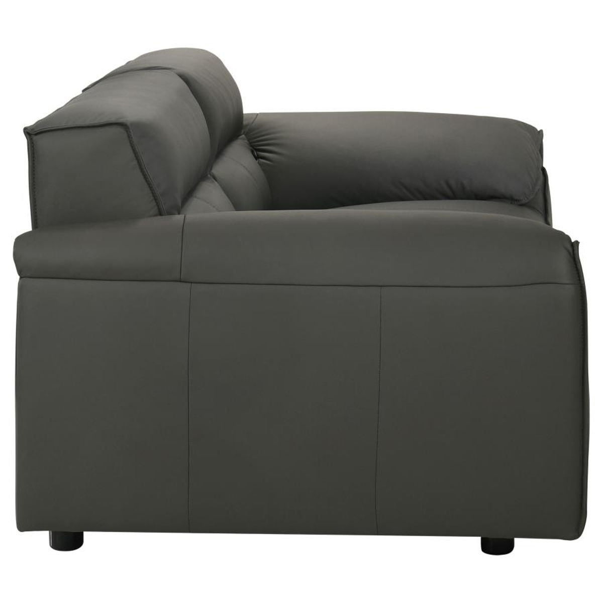 This leather-upholstered loveseat offers a perfect balance of sculptural simplicity and everyday luxury. Wrapped in 100% genuine top grain leather, it showcases smooth tailoring and a bold, low-profile silhouette. Wide, gently sloped arms and deep seats create an inviting feel, while high-density full foam cushions and a sinuous spring foundation provide lasting support. With its grounded form and refined materials, this piece brings quiet sophistication to any modern space.