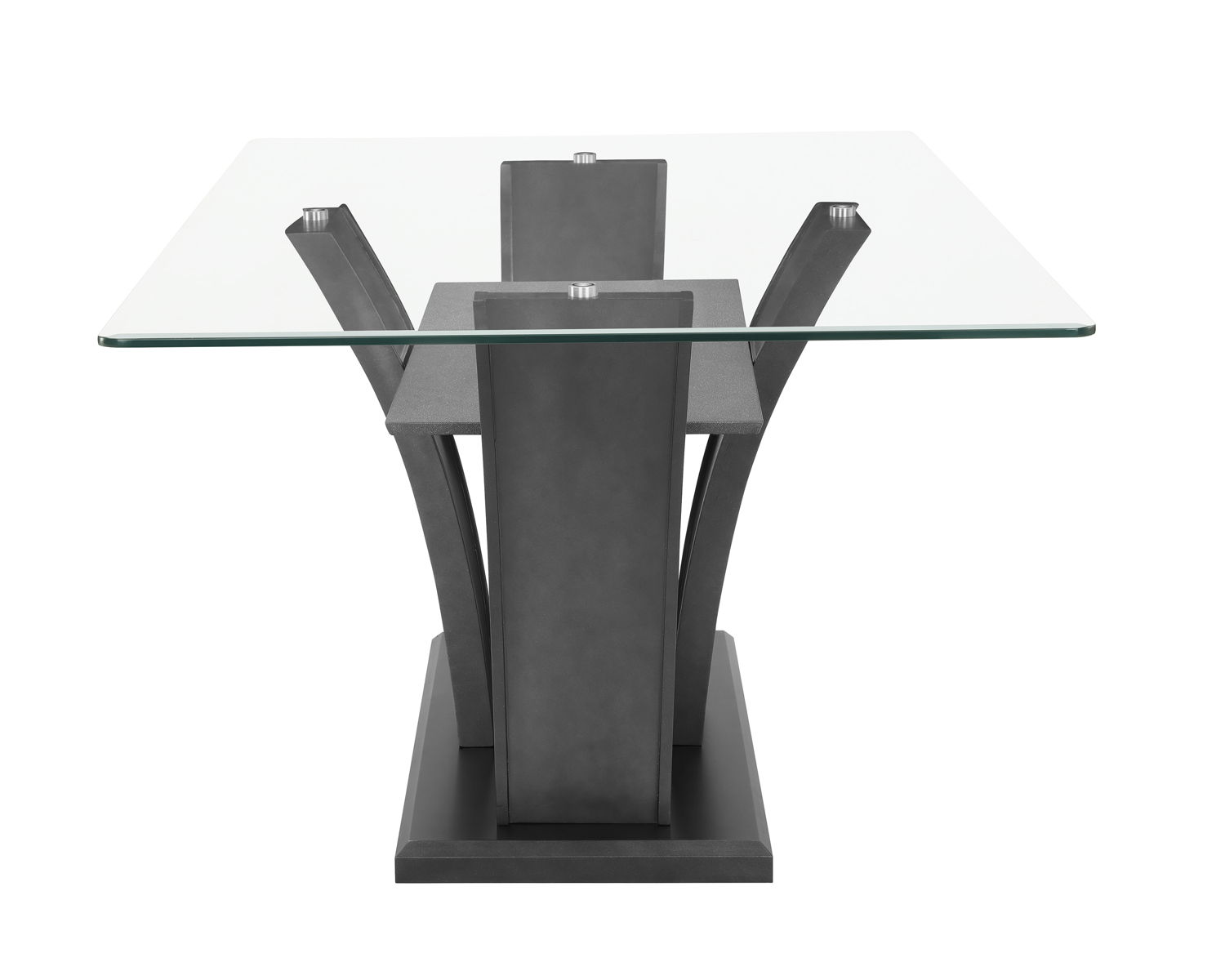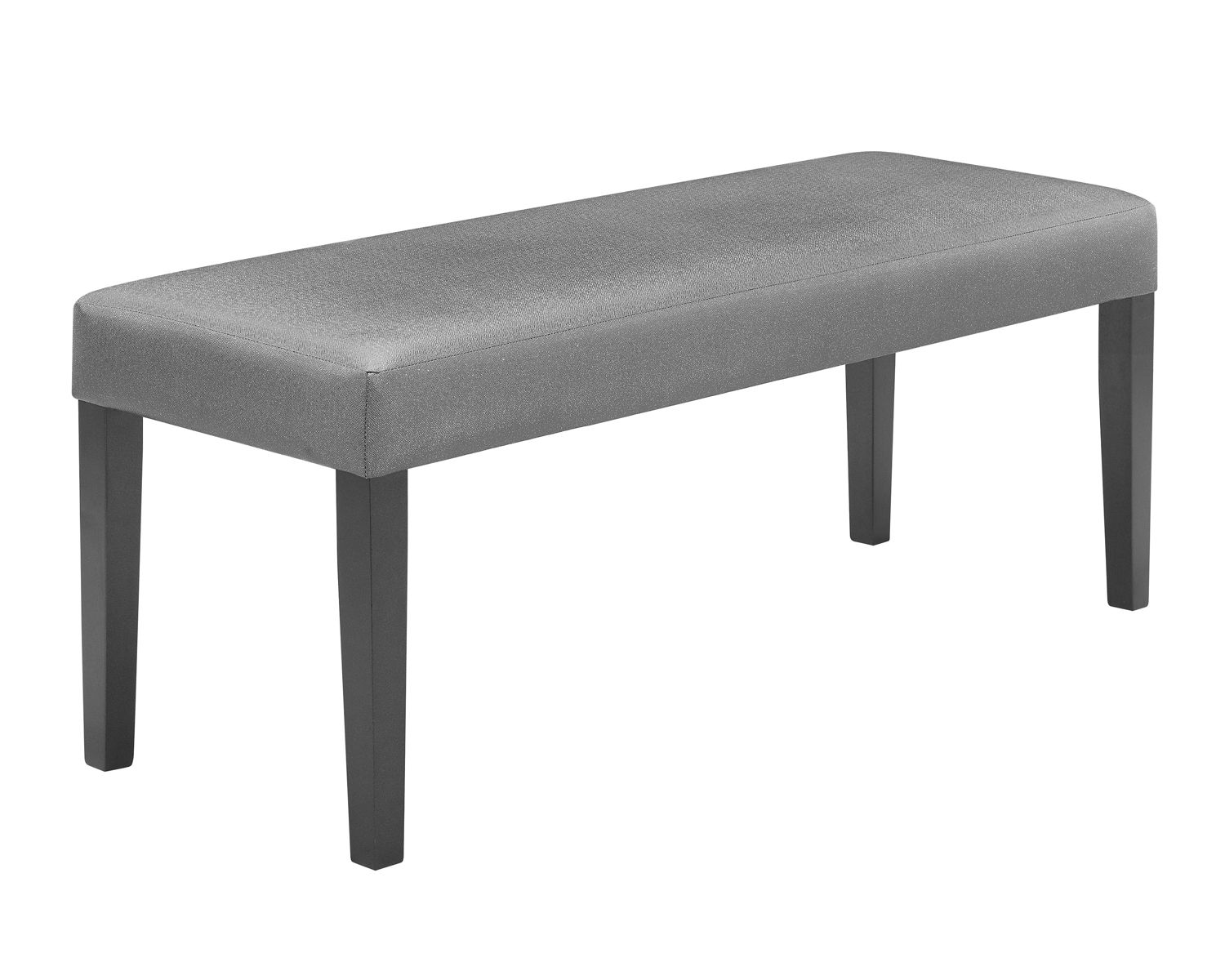This sleek and modern dining group bridges form and function. The sculptural dining table has a sturdy base and the glass top allows views of the upholstered open shelf. Streamlined chairs and bench feature finished wood and upholstery for contrast.