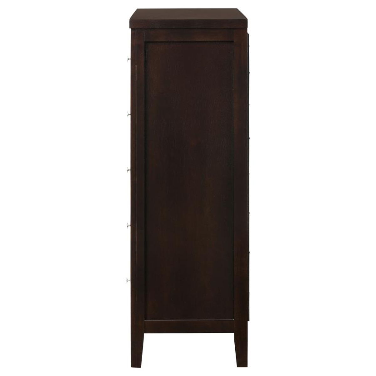 Organize your space with this five-drawer chest, offering clean lines and timeless appeal. The rich cappuccino finish enhances the warmth of its wood construction, while brushed silver hardware adds a subtle modern touch. Five spacious drawers provide ample room for folded clothing, accessories, and essentials. Built from rubberwood, veneer, and engineered wood for strength, this chest pairs lasting durability with classic elegance, creating a versatile addition to any bedroom layout.