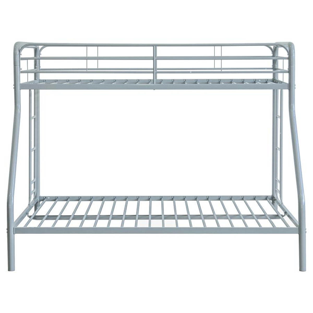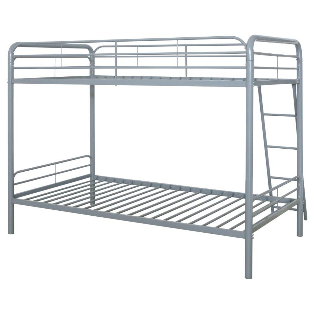 Maximize sleeping space with this modern metal bunk bed, designed for strength, safety, and everyday functionality. Its powder-coated glossy finish enhances the sleek silhouette, while full-length guardrails on the top bunk ensure secure rest. A built-in ladder provides stable access, integrated directly into the frame for a clean look and compact footprint. With metal slat support for both sleeping surfaces, this bunk bed eliminates the need for foundations and suits shared rooms with style and durability.