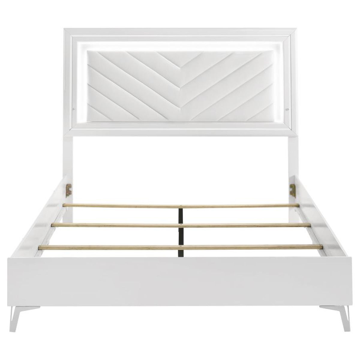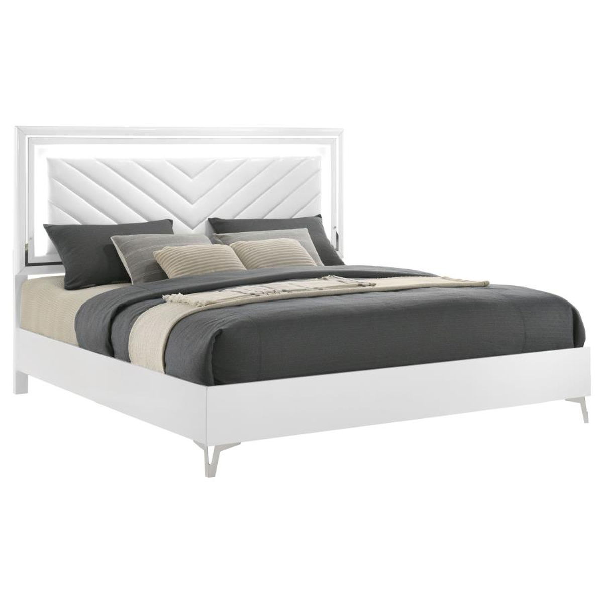 This modern bed showcases a high-gloss frame paired with a bold LED-lit headboard for striking impact. The panel headboard features a white faux leather insert with chevron channel tufting, framed by a white LED trim that casts soft ambient light. Clean edges and chrome-finished legs enhance its sleek silhouette, while the low footboard keeps the focus on the illuminated design. A foundation is required to complete this stylish bedroom centerpiece.