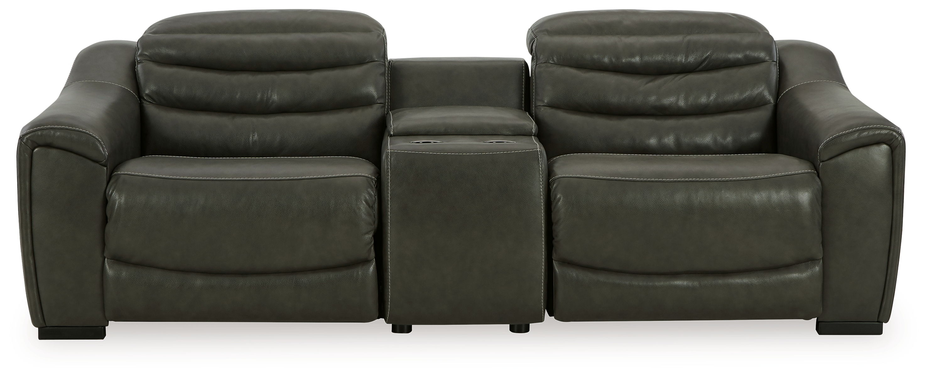 For those seeking to curate a living room retreat that offers superior comfort and a contemporary aesthetic, this sleekly designed power reclining loveseat with console will become your favorite source of at-home serenity. Rest on real leather in the spacious seating area, and use the one-touch power control to recline and adjust the headrests with ease. As you recharge after a long day, your devices can too with USB charging.