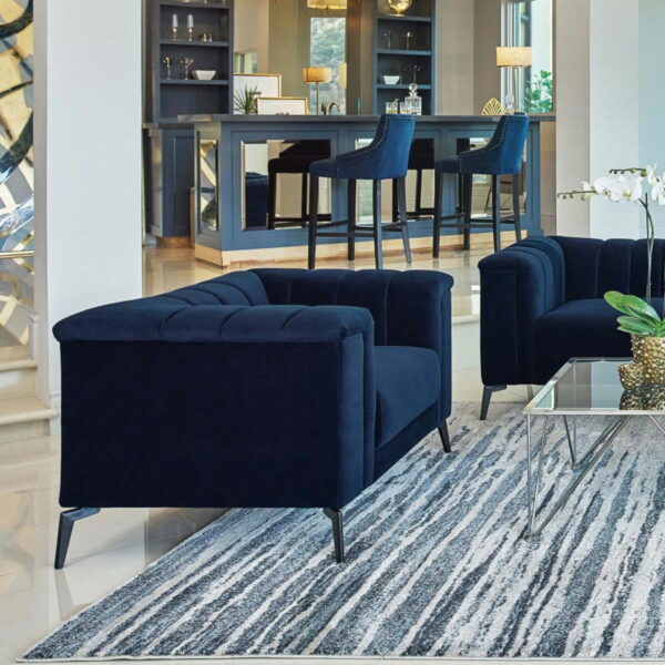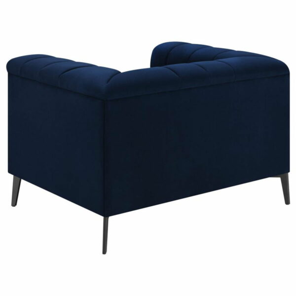 A sumptuous transitional accent chair will be a vibrant addition to your home. You’ll love the stunning navy blue matte velvet fabric upholstery for its softness and visual appeal. The bench-style seat with pocket coil springs will offer the perfect comfort and support for your needs. Deep vertical channels highlight the shelter back and inside arms. Tapered black metal legs put the finishing touches on this vibrant chair that will become a family favorite.
