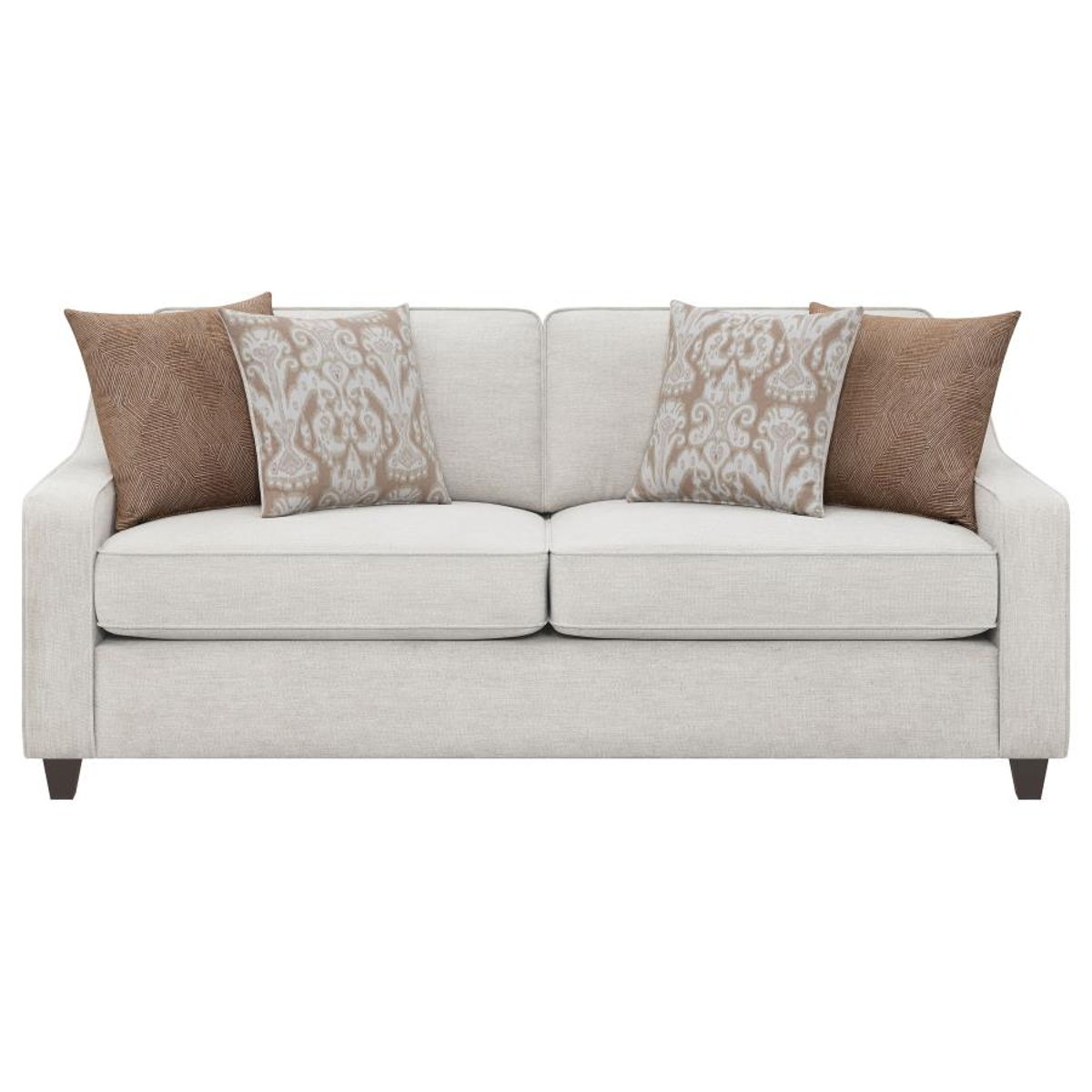 Wrapped in a cheerful, beige woven chenille upholstery, this seating set exudes a look of sophistication. Sloped track arms add elegant lines while tapered dark brown legs add a striking contrast. Understated yet regal, this transitional seating set works inside farmhouse and contemporary style homes effortlessly. Dense and plush boxed seat and back cushions feature classic welt details, as coral and copper tone accent pillows lend a boho-like tough. Add this upholstered furniture set into a space for a subtle chic aesthetic.