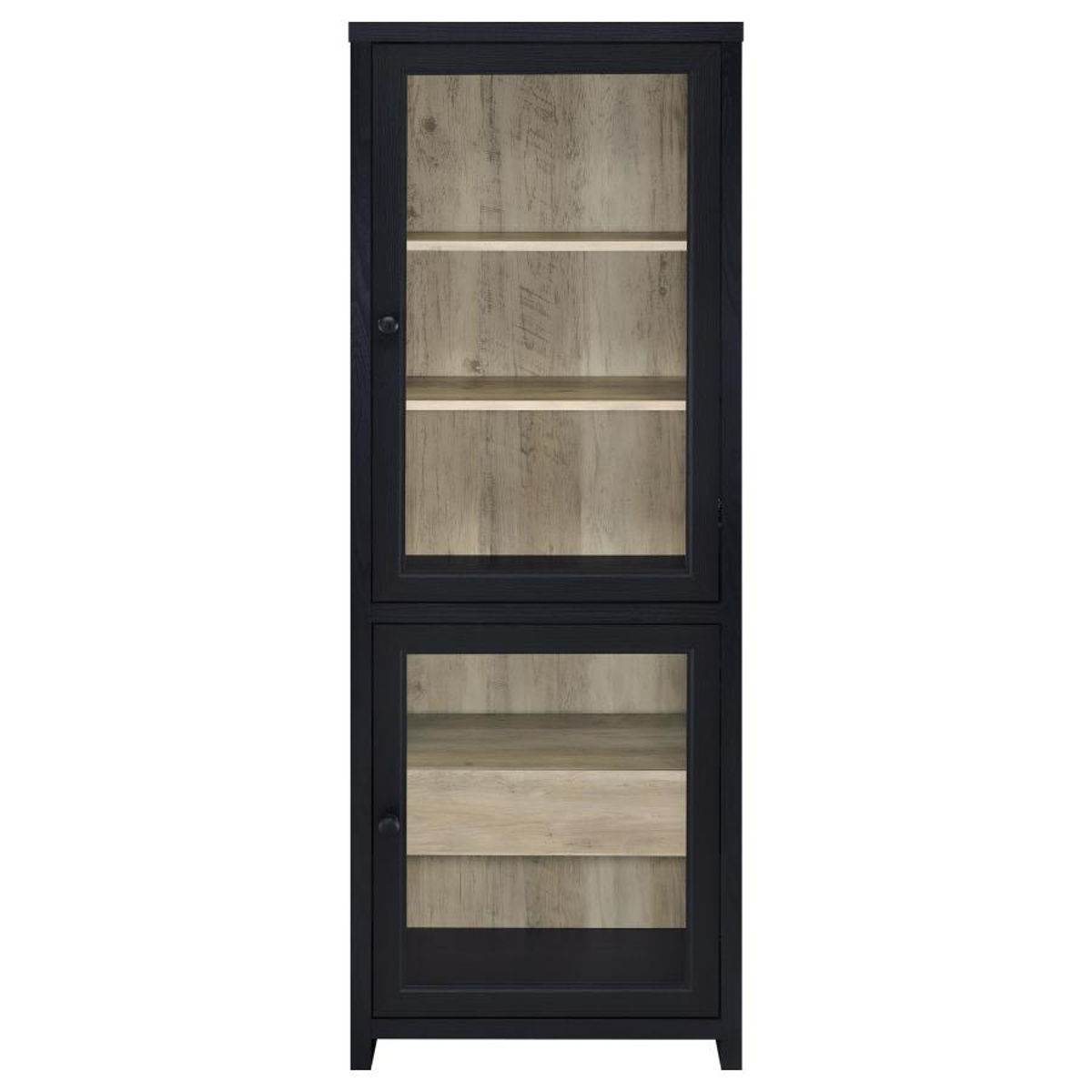 This three-piece entertainment center brings bold character and quiet refinement to the modern living room. Framed in matte black with framed glass doors and a natural wood-look interior, it offers a striking contrast that feels both grounded and elegant. Adjustable shelving provides room to display, while hidden drawers and cabinets keep everyday items tucked neatly away. With its tall, architectural profile and warm two-tone finish, this ensemble transforms your media setup into a curated focal point.