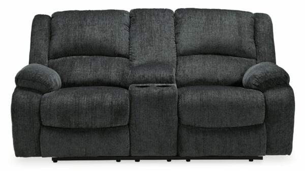 Built for luxury, this reclining loveseat with center console lets you kick back in reliable style. The thick, softly textured chenille upholstery provides a comfy surface on which to lounge. With bustle back construction and thickly cushioned armrests, this piece gives you the dependable support you need to unwind with the convenience of the center console to ease your evening.