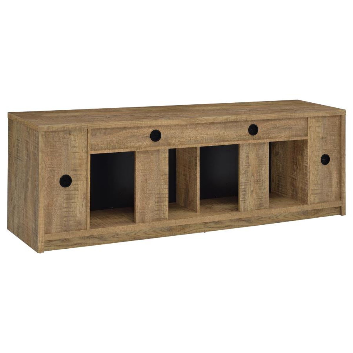 This expansive fireplace media console delivers the perfect fusion of storage and style for spacious living areas. A wide electric firebox rests atop a bed of glistening crushed acrylic crystals, offering fifteen flame color options controlled by a wireless remote. Dual open cubbies provide easy access to devices, while two cabinet doors conceal adjustable shelves for flexible storage. Crafted from engineered wood with a mango-tone laminate veneer, each compartment includes rear cutouts for wire management. Please note that this console does not include a heat function.