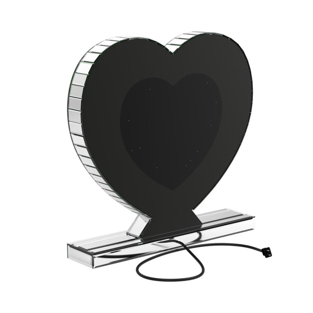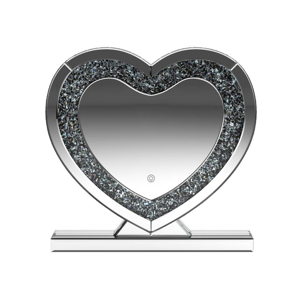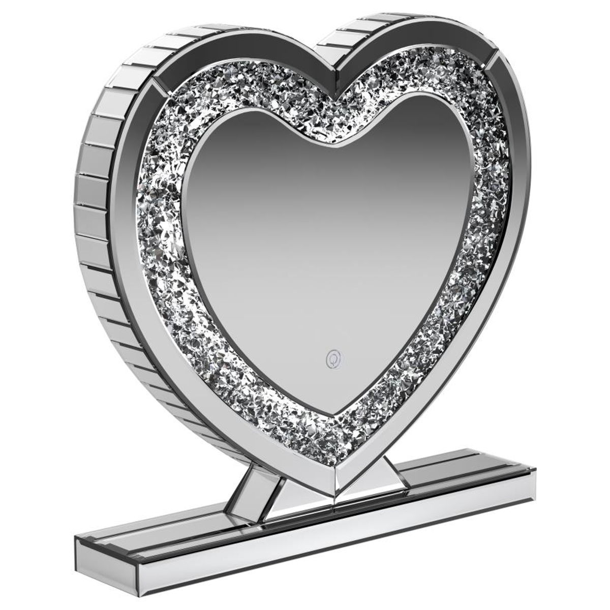 Draw attention to a heart motif with this whimsical table mirror. The heart shape mirror features a silver frame and stand for displaying on a table or shelf. This accent mirror provides sculptural depth when displayed on a bookcase along with other keepsakes. The clear mirrored surface adds a dimensional element that draws the eye. This contemporary mirror could also serve as an artsy accent on a dresser or nightstand.