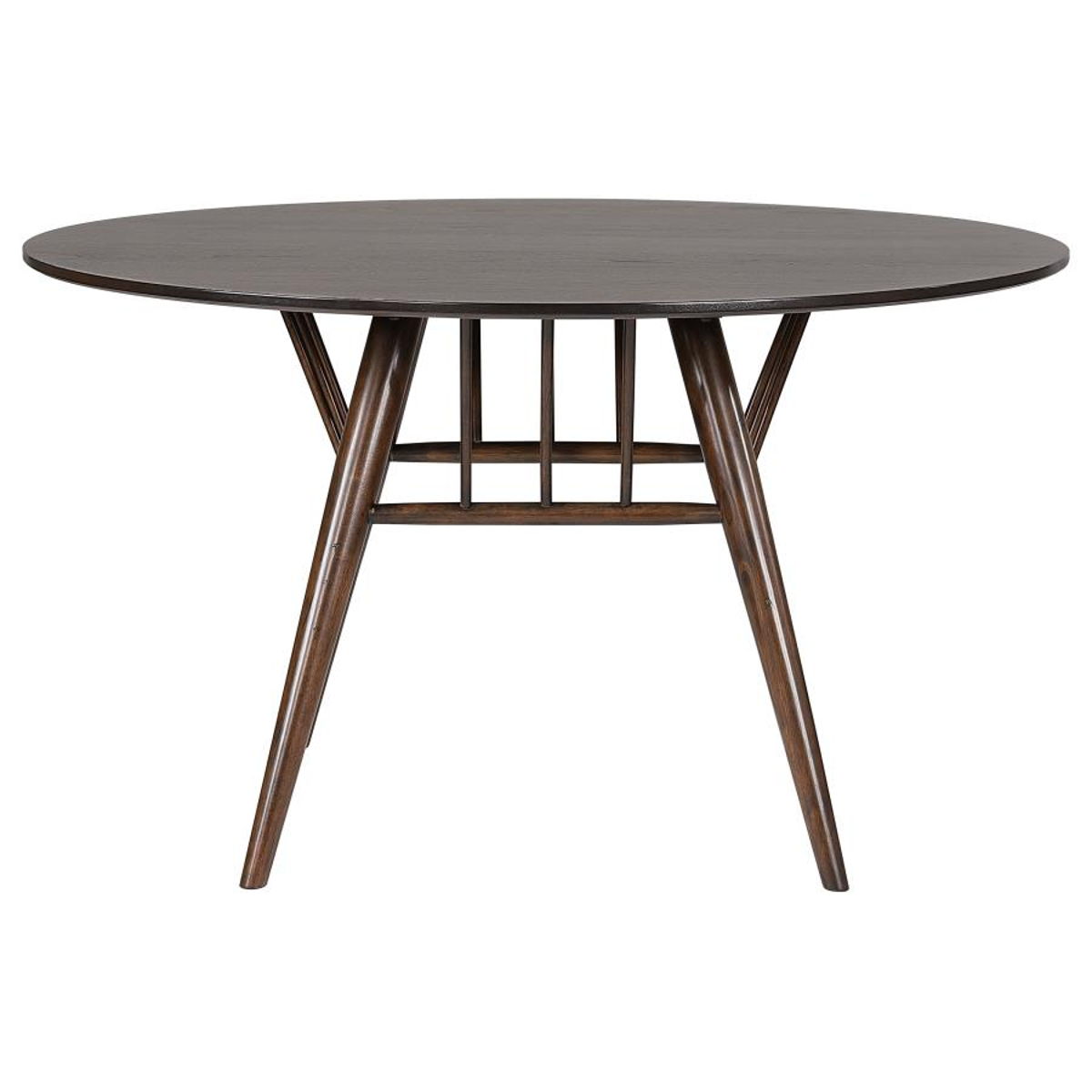 Offer classic mid-century character with this vintage style five-piece dining set. Designed to create texture and depth in your existing decor, it boasts a charming spindle detail underneath the tabletop, perfectly complementing four side chairs. A dark walnut wood finish is deep and rich. Chairs are further adorned with foam padding on seats and wheat-colored upholstery for a warm, neutral touch. Choose this set for a mid-century kitchen or traditional dining room.