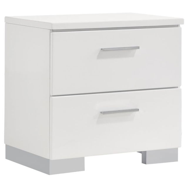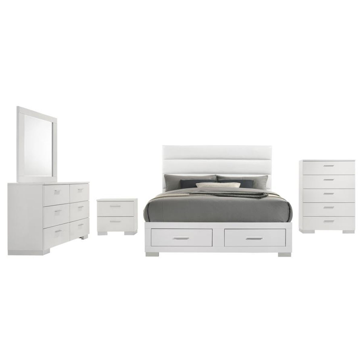Transform your bedroom into a modern oasis with this sleek bedroom set, blending contemporary design with practical functionality. Anchored by a stunning upholstered bed wrapped in faux leather, the set exudes a minimalist aesthetic complemented by clean lines and high-gloss finishes. Spacious case pieces, including a nightstand, dresser, dresser mirror, and optional chest, feature polished chrome accents and smooth drawer glides for effortless operation. Perfect for bedrooms of any size, this set offers both style and storage for a refined and organized space.