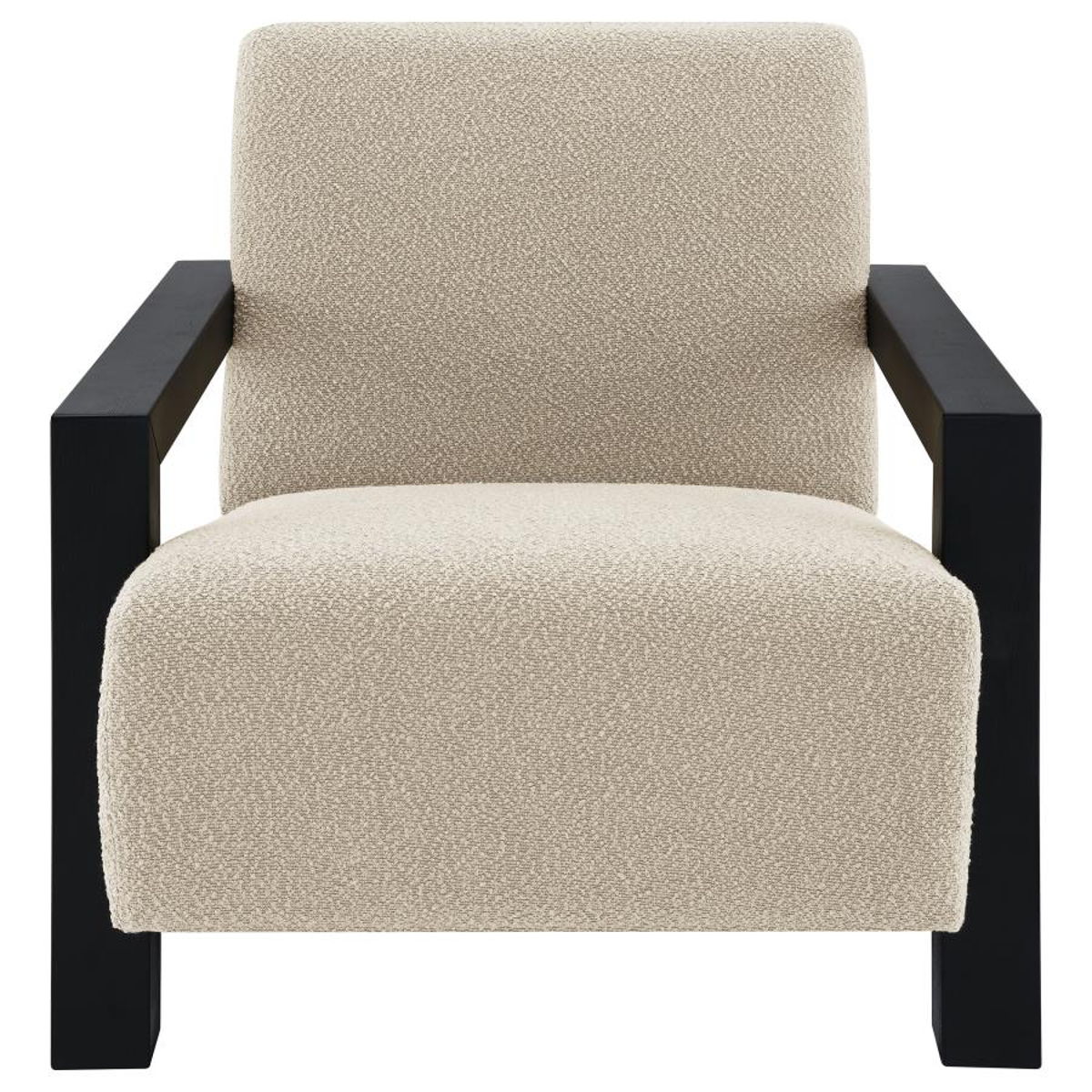 Exposed wood armrests add a sense of precision and structure to a modern accent armchair. It’s a fresh, refined look with a neutral palette and minimalist allure. A slightly reclined seat and back create an inviting silhouette for the chair, which blends beautifully in personal and professional settings. Boucle upholstery is fresh and contemporary, offering impressive texture and depth. Add an accent pillow for a splash of color that coordinates with surrounding decor.