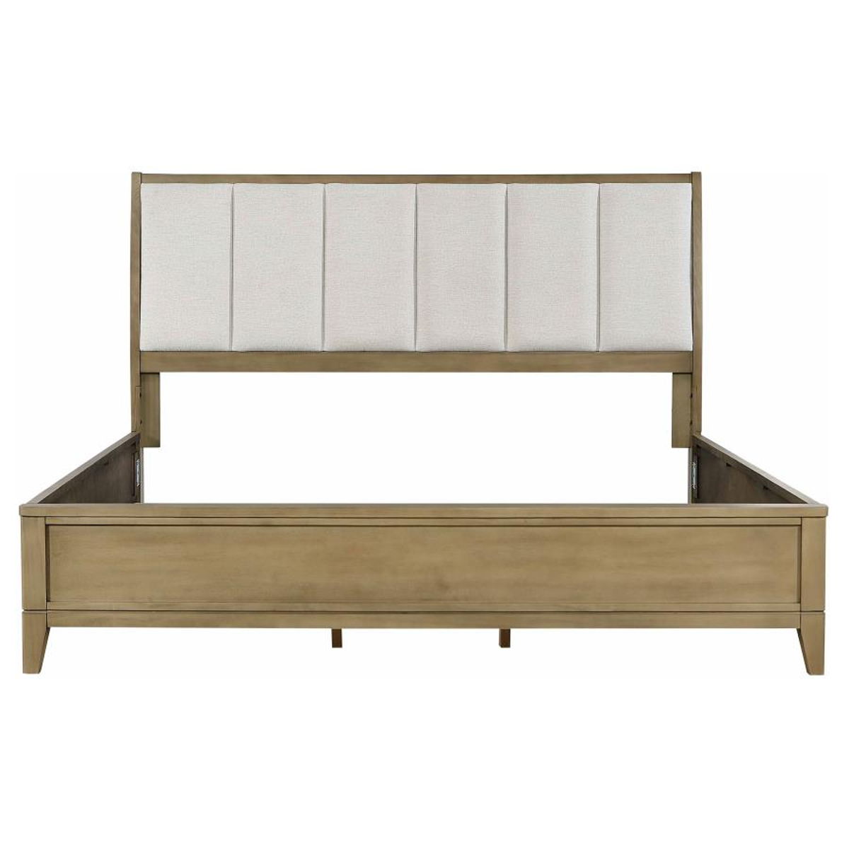 Elevate your bedroom with this bed that seamlessly blends transitional style with modern flair. The bed features a vertical channeled upholstered headboard in beige textured fabric, adding a touch of elegance and comfort. Its natural pine finish brings warmth and a sense of timelessness to your space. The wrapped rails to the footboard enhance the bed’s sleek, streamlined profile. Perfect for any bedroom, this bed combines classic craftsmanship with contemporary design elements.