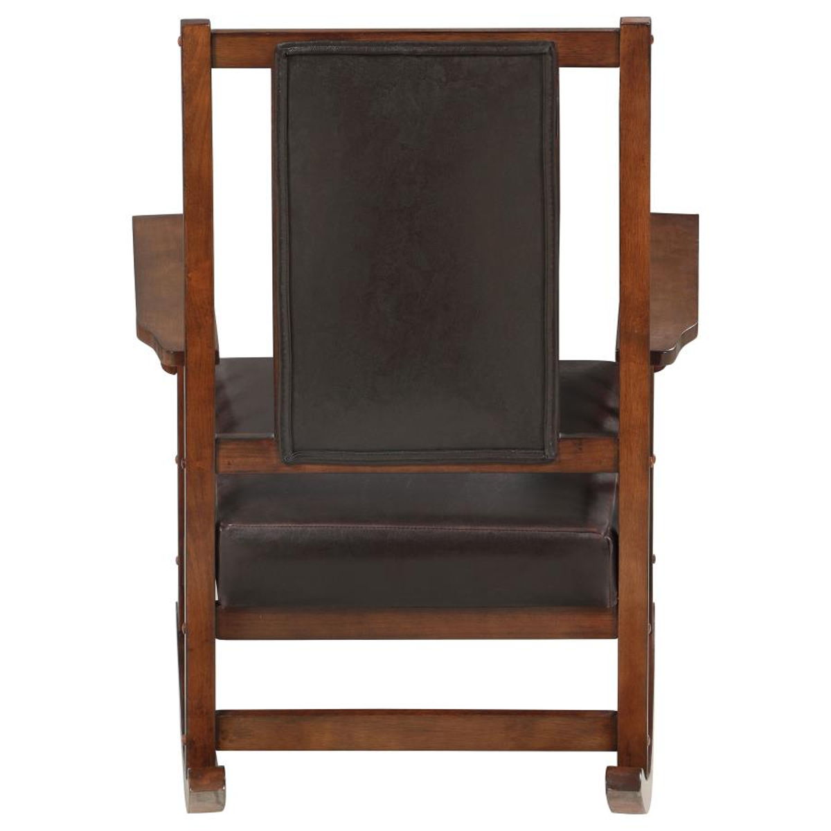 Easy, relaxing motion is always a pleasant experience, and this rocker chair offers comfort as well as aesthetics. With a hint of mission styling, its linear silhouette captures attention. Perfect for a transitional space, its lush tobacco finish tobacco finish frame and split leather and PVC padded seat and back make a gorgeous pair. Enjoy a fluid movement from a rocker base. This beautiful chair is a solid choice for a study or den.