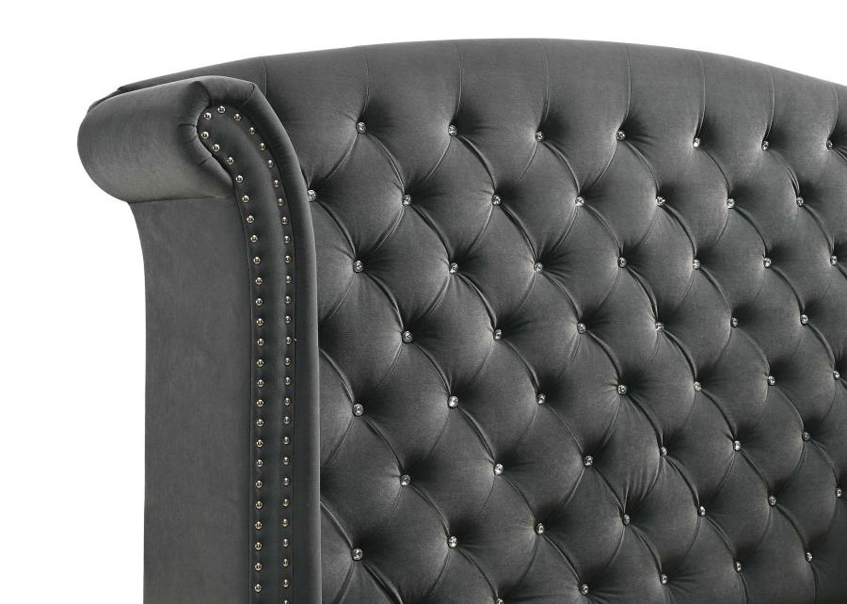 Every morning you’ll wake up like you’re living in a castle with this exquisite traditional style upholstered bed. An elegantly dramatic wingback style headboard makes a stunning focal point in your sleeping space. Adorned with nail head trim and button tufting, the velvet is luxuriously soft to the touch. This bed is supported on a low profile with sleek silver chrome legs. Regal and plush, this piece is the epitome of style and function.