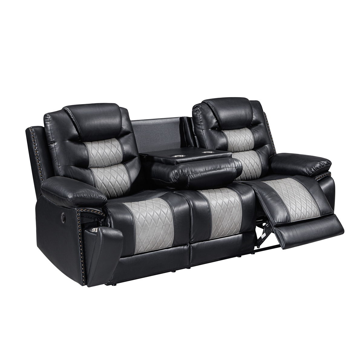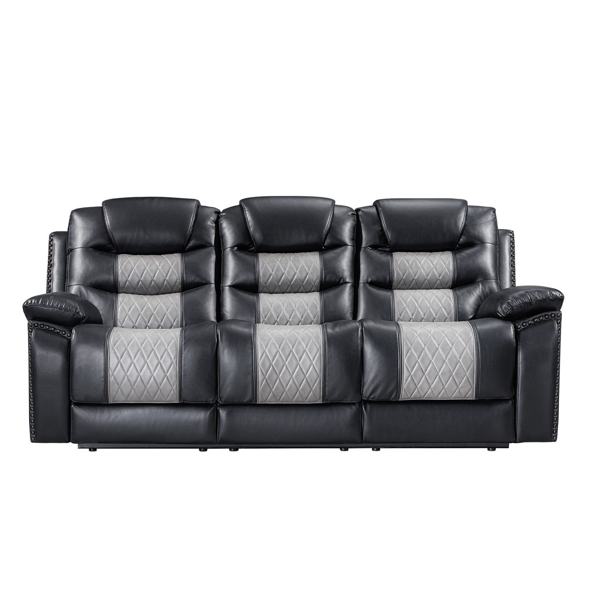Enhance your living space with the Nikko Dual Recliner Sofa with Hidden Cupholders and Drop Down Snack Tray . This sofa, constructed with hardwood and plywood frames, promises long-lasting durability and stability. Luxurious comfort is ensured with resilient foam cushions and pocket coil support, providing a cozy place to lounge. The two-tone fabric, made from a blend of 80% polyester and 20% PU, offers the soft touch and look of leather while remaining breathable. Distinctive details such as nailhead trim, diamond stitch pattern seats, double wrapped headrests, and expert tailoring make this sofa stand out in any home. Enjoy practical lifestyle features like the center back cushion that conveniently drops down into a snack tray complete with beverage holders, and hidden pull-out cupholders discreetly housed under the armrests. Plush pillowed arm and headrests, reclining backs, and comfortable footrests provide the perfect place to unwind. Upgrade your living room with the Nikko Dual Recliner Sofa and experience unparalleled comfort and style.