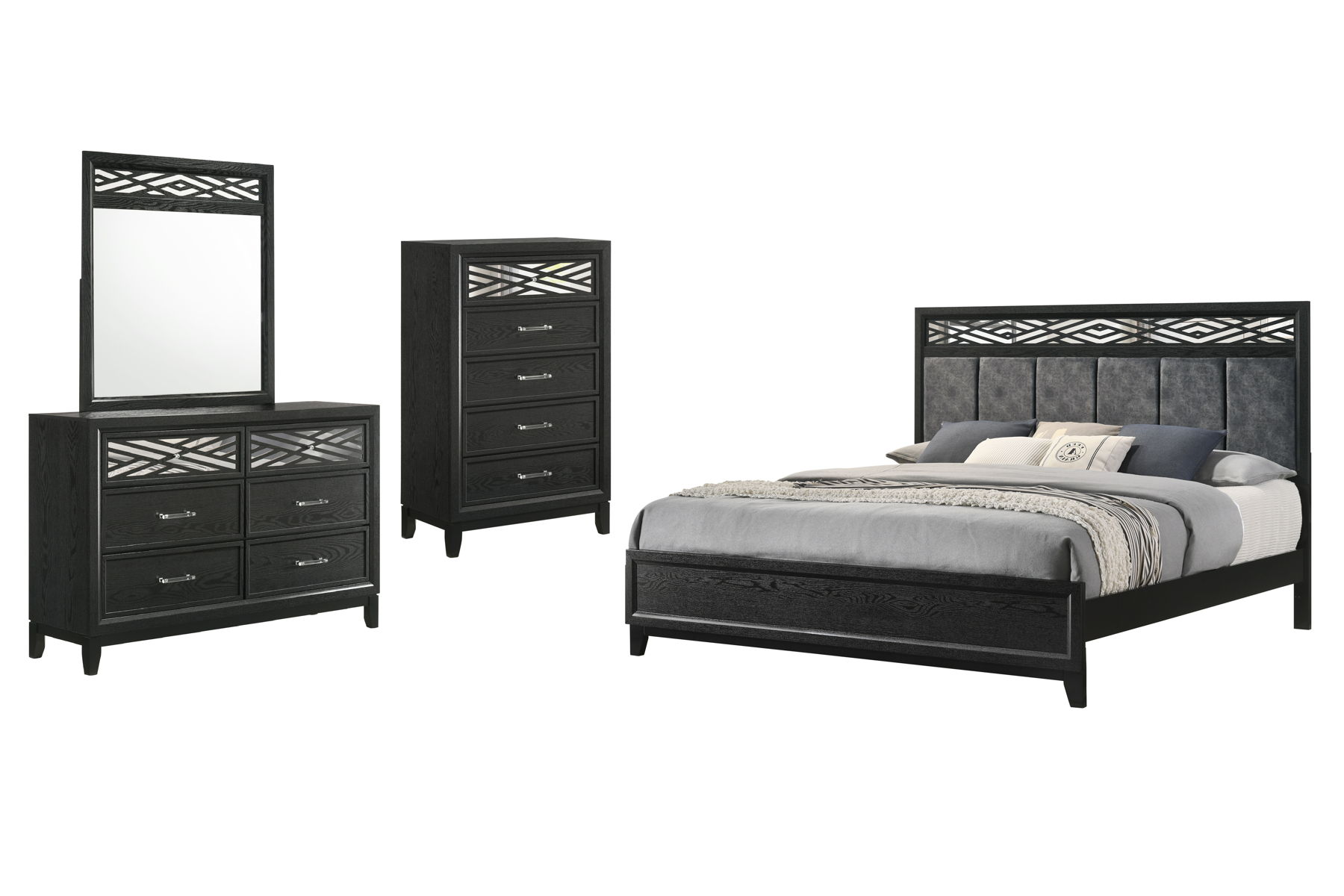 The Obsidian Bedroom Set is the ultimate in luxurious and modern bedroom design, offering both style and functionality. This comprehensive set includes a beautifully designed panel bed with a plush padded headboard, a spacious dresser, a matching mirror, a versatile chest, and two elegant nightstands, all in a sleek finish. Each piece is expertly crafted from premium solid Rubberwood, enhanced with manufactured woods and veneers to ensure lasting beauty and the durability of genuine wood. The design is sleek and sophisticated, featuring clean lines and a chic, low-sheen finish that exudes refined elegance. Geometric cut-outs backed with mirror-like Mylar add a luxurious touch, elevating the aesthetic with modern glamour. The bed’s headboard is upholstered in ultra-soft, easy-care 100% polyester, with a channeled design that provides both comfort and striking style. The dresser, chest, and nightstands offer ample storage with smooth-gliding drawers, featuring durable Kenlin Glides and stylish acrylic drawer pulls. Each drawer is meticulously crafted with quality dovetail joinery and finished interiors, ensuring a snag-free, elegant storage solution. This bedroom set is perfect for those seeking a sophisticated blend of fashion, function, and enduring quality in their home.