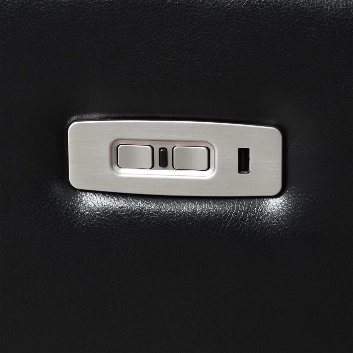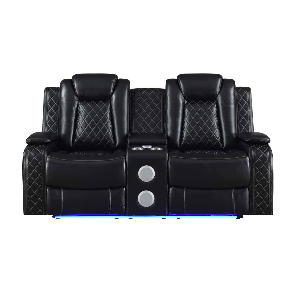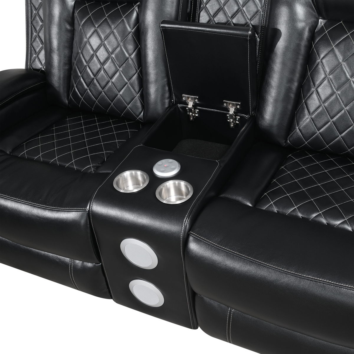 Meet the Orion Console Loveseat, a marvel of durability and comfort designed to elevate your relaxation experience. Crafted with a blend of hardwoods and manufactured wood, its sturdy construction ensures long-lasting strength. Sink into the soft, breathable upholstery, a luxurious blend of polyester and PU, for a supple feel and cozy seating. Experience smooth reclining action thanks to top-quality mechanisms, while high-density foam and pocket coil cushions wrapped in Dacron offer unparalleled support. Expert tailoring, including white contrast stitching and a distinctive diamond pattern, adds a touch of sophistication to its sleek design. Lift up the pillowed arms to reveal convenient storage compartments and silver drink holders. Complete with theater lighting, Bluetooth speakers, wireless charging pad, and USB ports, this loveseat brings the movie theater experience to your living room. Upgrade your comfort with the Orion Console Loveseat today.