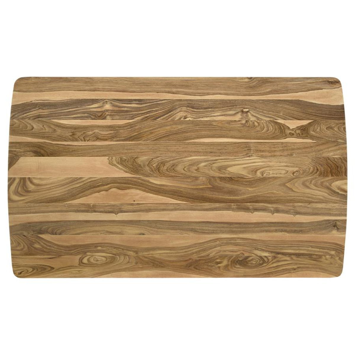 With a hint of ranch inspiration, the design of this counter height dining set is a brilliant choice for an easy, casual living space. Indulge in a calm vibe with a set anchored by a natural finish sheesham table featuring a spacious rectangular top and tapered, rounded legs. A dark apron with geometric design detail adds an exotic effect. Mid-Century Modern influence adds to four comfortable counter stools with scoop seats and a thick back, both with horizontally channeled leather upholstery. Metal framing features iconic retro slender rounded, splayed legs.