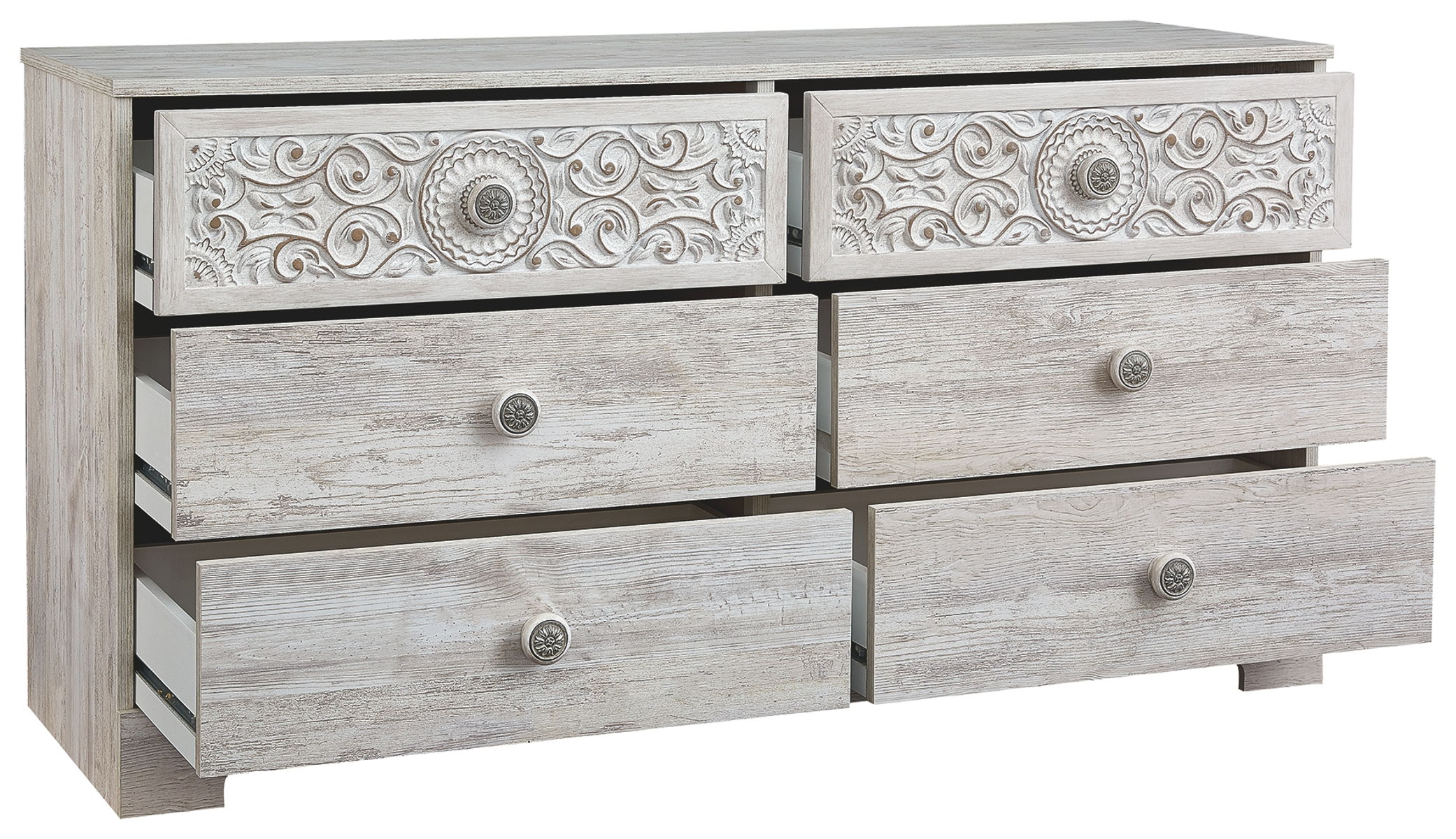 - 6 spacious smooth-gliding drawers; vinyl-wrapped sides and back for extra durability