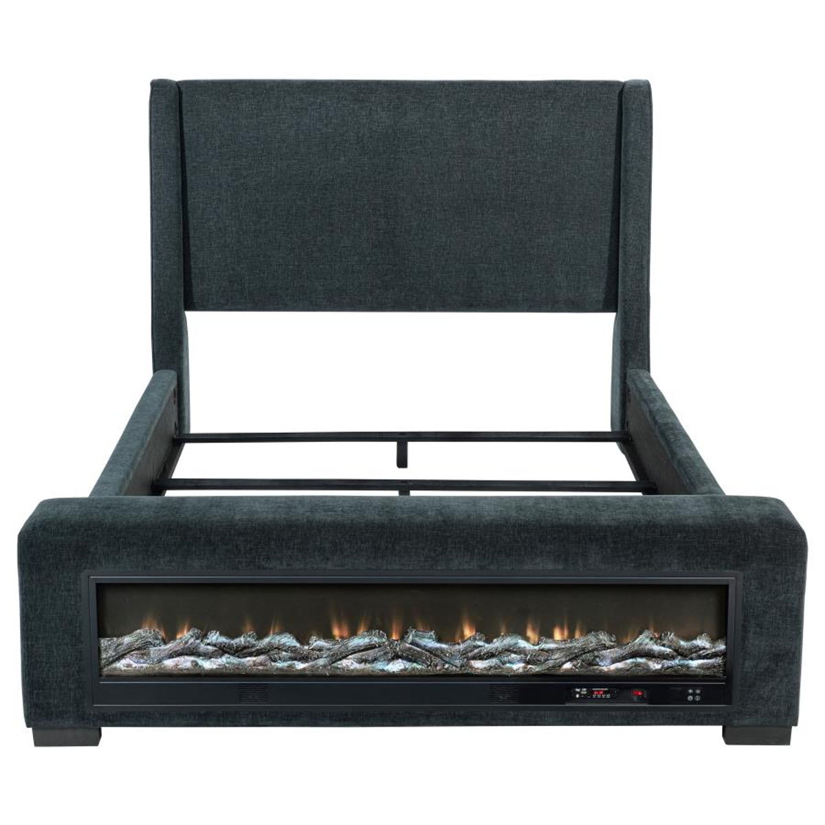 Elevate your bedroom with this sophisticated upholstered bed in a stunning fabric. Featuring a modern wingback headboard, this bed combines bold style with inviting comfort. The footboard boasts a visual flame box insert for a cozy ambiance, complete with 13 color options, adjustable brightness levels, and a wireless remote control. Crafted from durable birch, plywood, and engineered wood, this bed ensures lasting quality. The integrated Bluetooth speaker enhances functionality, making this bed a modern centerpiece for your space.