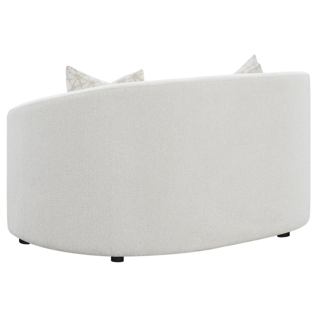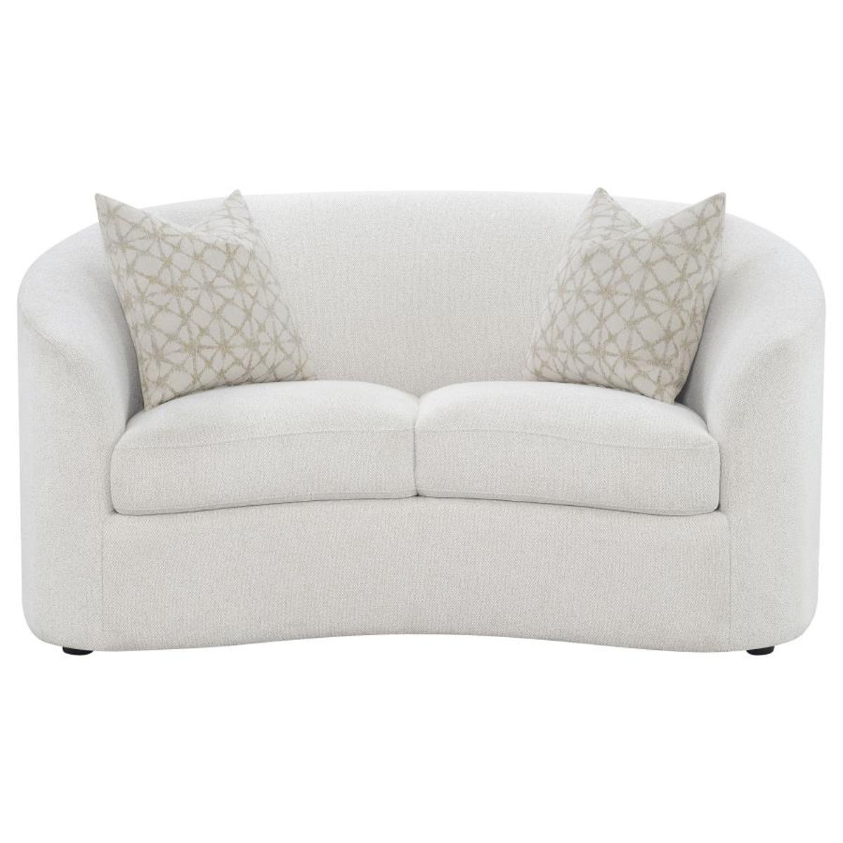 Create your modern entertaining area with this mid-century modern-inspired contemporary seating set, upholstered in a neutral finished boucle fabric across its elegant and curvy silhouette. Curved and sloped armrests and plush cushions keep family and visitors comfortable all through the gathering. Coordinating boucle accent pillows with premium faux down fill provide extra comfort as discreet black legs offer a bit of elevation and definition over decorative rugs.