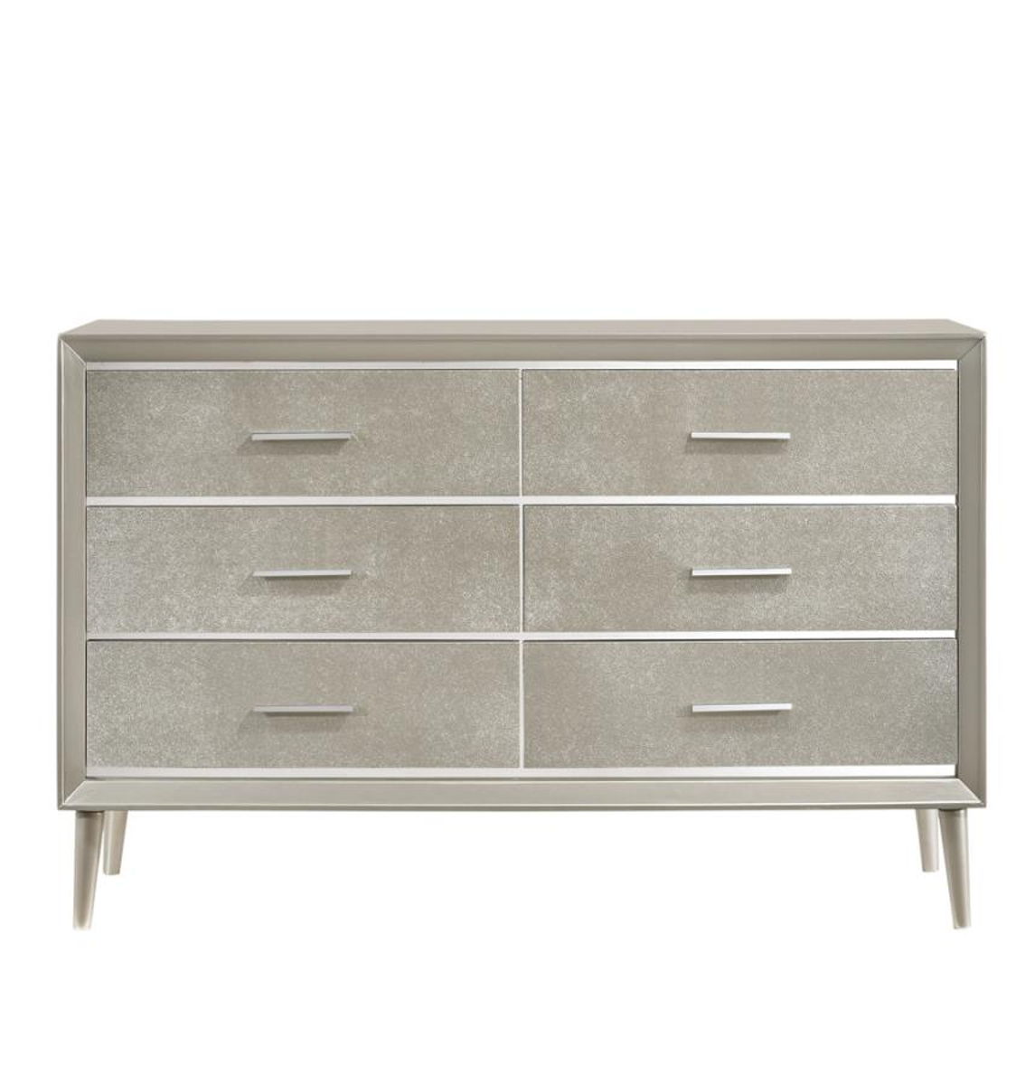 Add ample storage and exquisite style to any bedroom in your home. Sleek and elegant, this silver dresser has a truly glamorous design. Its beveled, picture frame front is beautifully enhanced by shining lines of mirrored acrylic. A metallic silver finish amplifies its stylish silhouette. With a felt-lined top drawer and plenty of storage space, this six-drawer dresser is ideal for storing even the most delicate items.