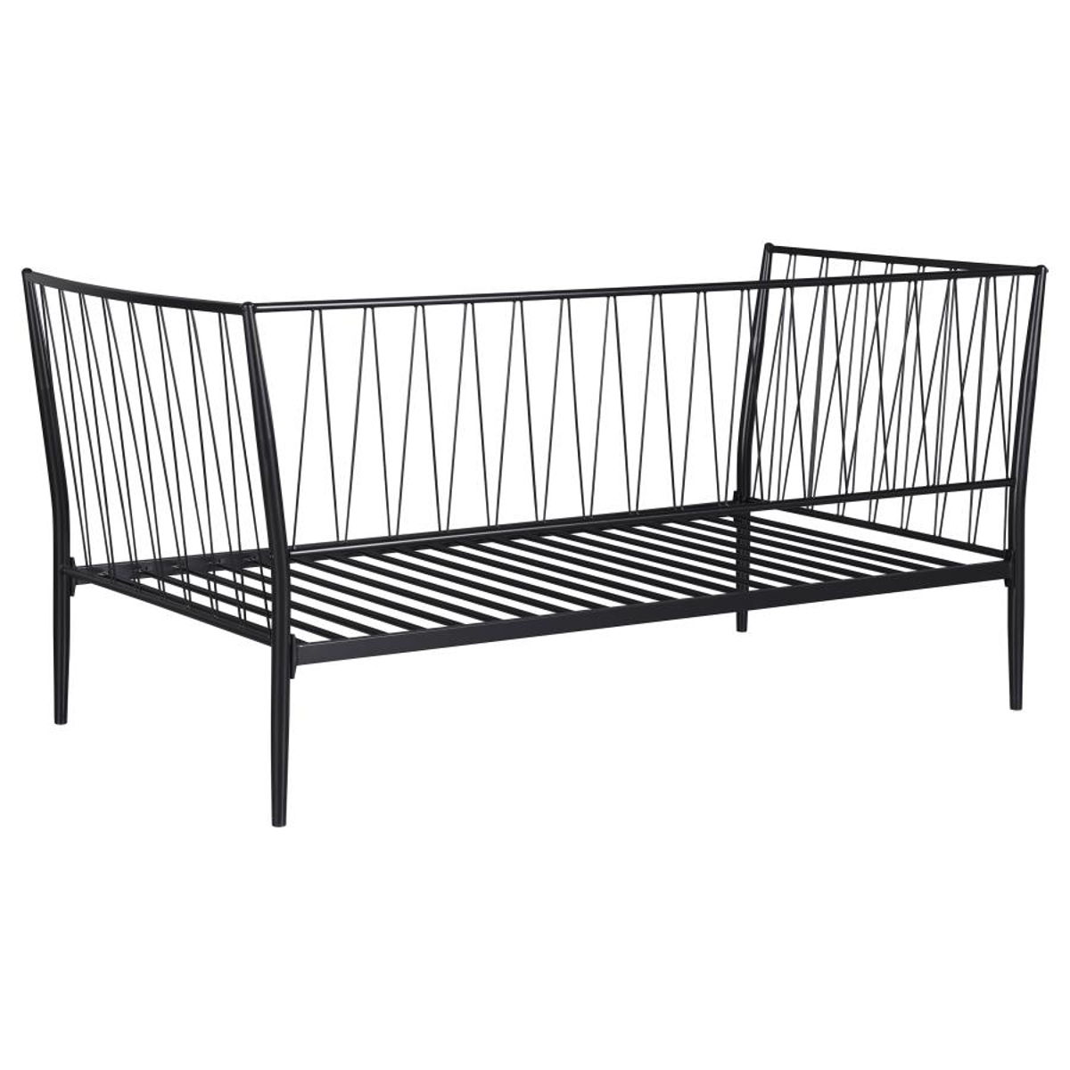 This transitional-style metal daybed combines sleek aesthetics with durable functionality, making it ideal for guest rooms or compact spaces. The design features slim, vertical metal slats with an angled backrest for a subtle modern flair. Welded metal construction ensures strength and stability, while the powder-coated matte black finish resists wear and adds sophistication. The integrated metal slatted platform provides dependable mattress support without requiring a box spring, emphasizing its minimalist appeal.