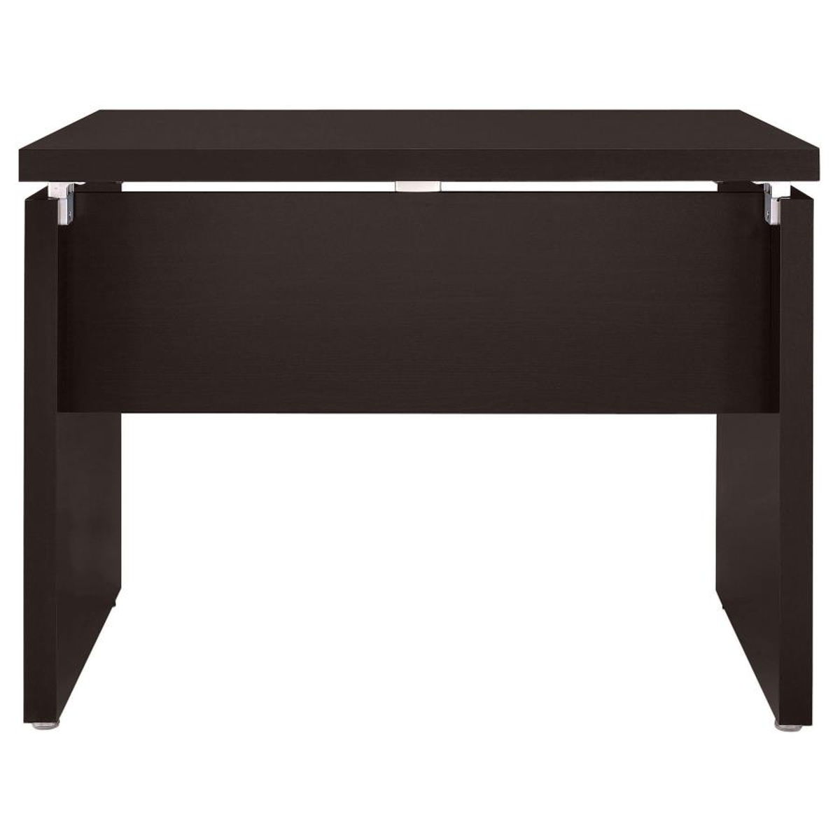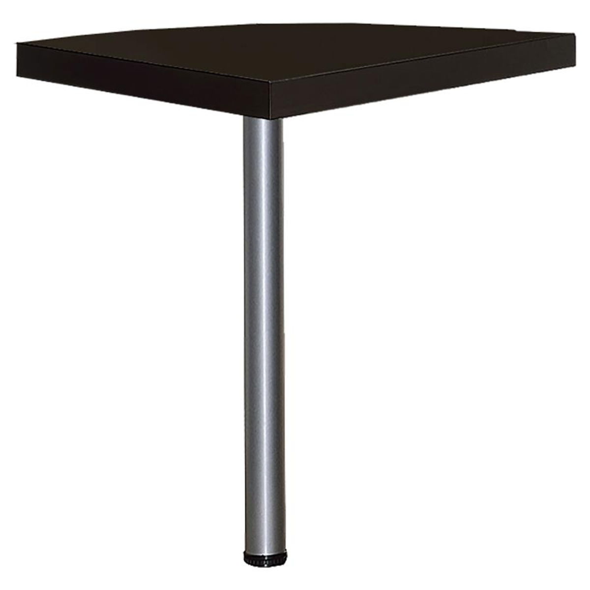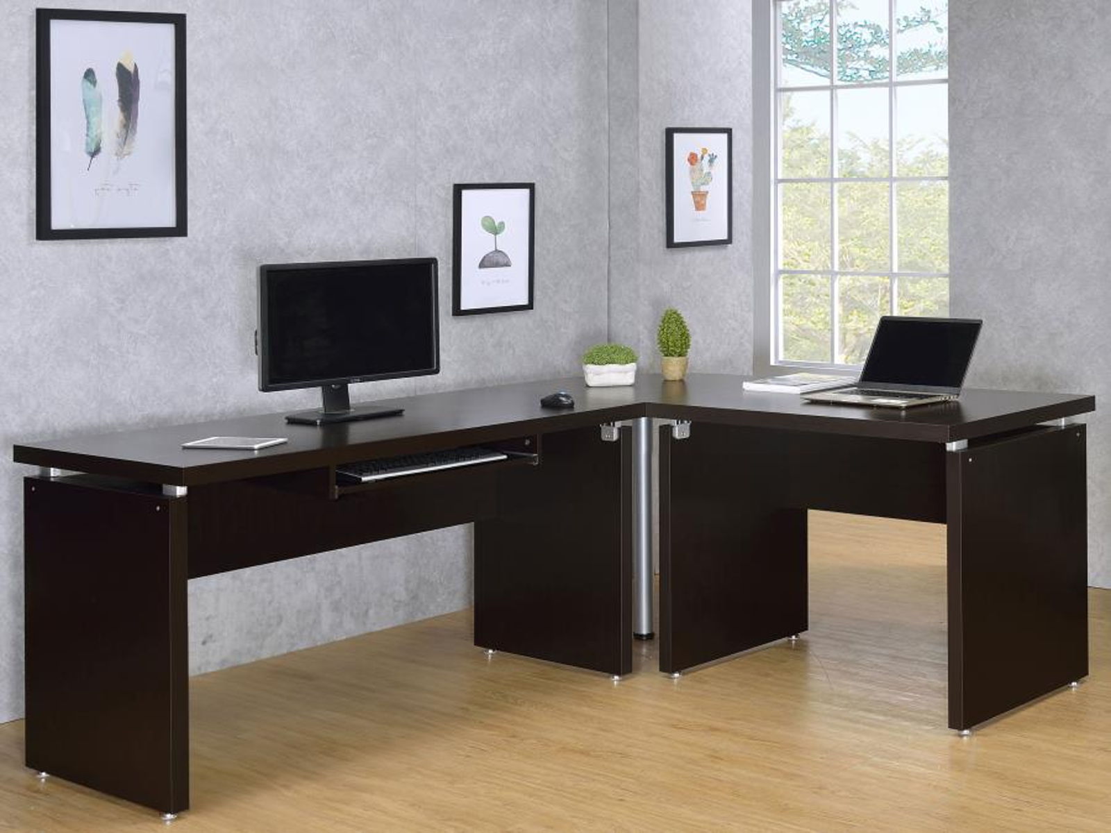 Outfit an office at home or in a workplace. Trending and practical, this corner table joins a duo of components to form an L-shaped desk configuration. With a cappuccino finish, it’s inviting and versatile. Silver hardware offers a universal match. Make the most of a home or office space and create more space for efficient productivity.