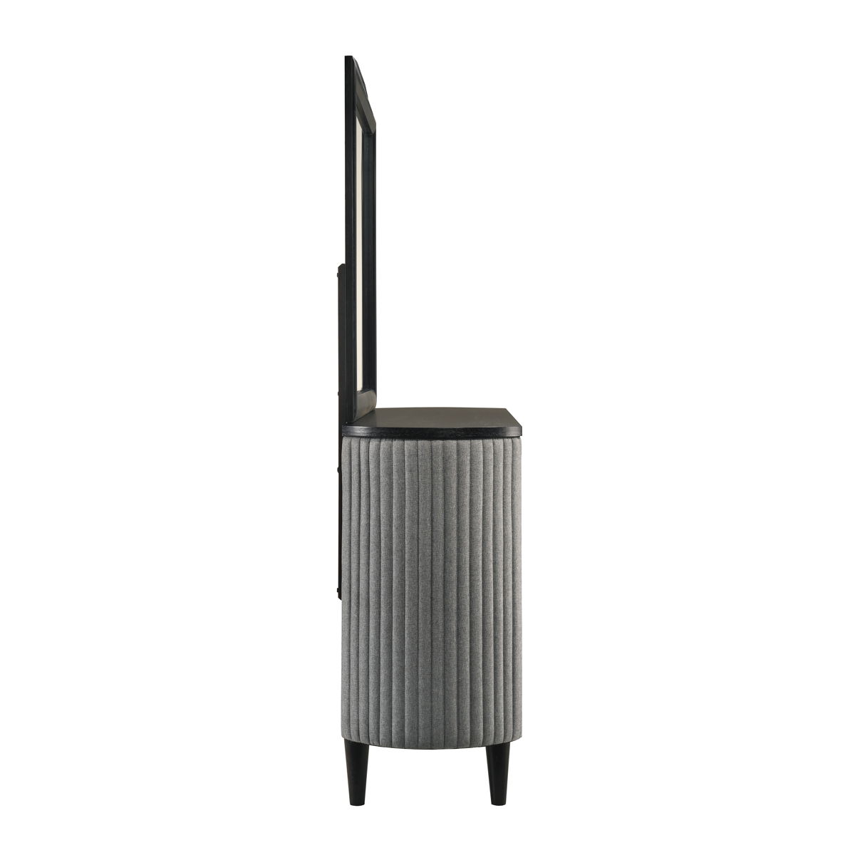 - Mixed Material Mastery: Textured gray ribbed fabric curves around each side of the nightstand, creating a striking contrast against the dark wood finish, adding visual intrigue while softening the overall look.