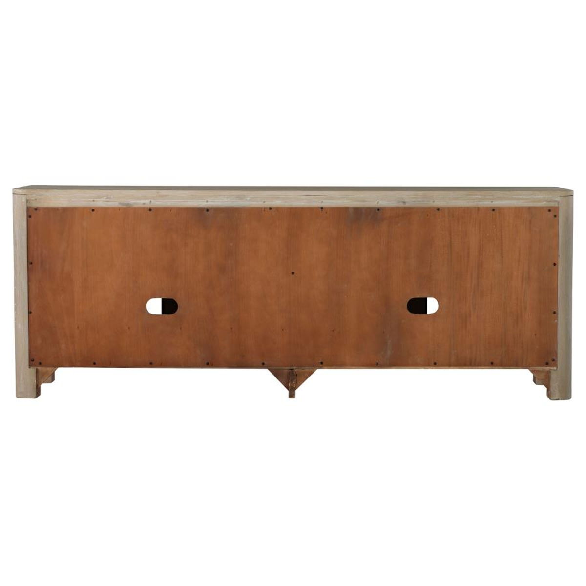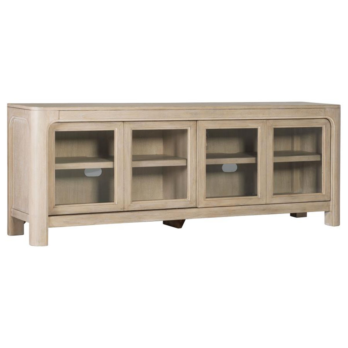 With its balanced proportions and sculptural form, this TV stand merges graceful design with everyday utility. Arched detailing softens the wide frame, while dual sliding glass doors reveal interior shelving for components and décor. Built-in cable cutouts keep wires neatly tucked away. Made from mahogany, engineered wood, and mango veneer, this media console offers lasting strength and natural texture—ideal for any living room setup.