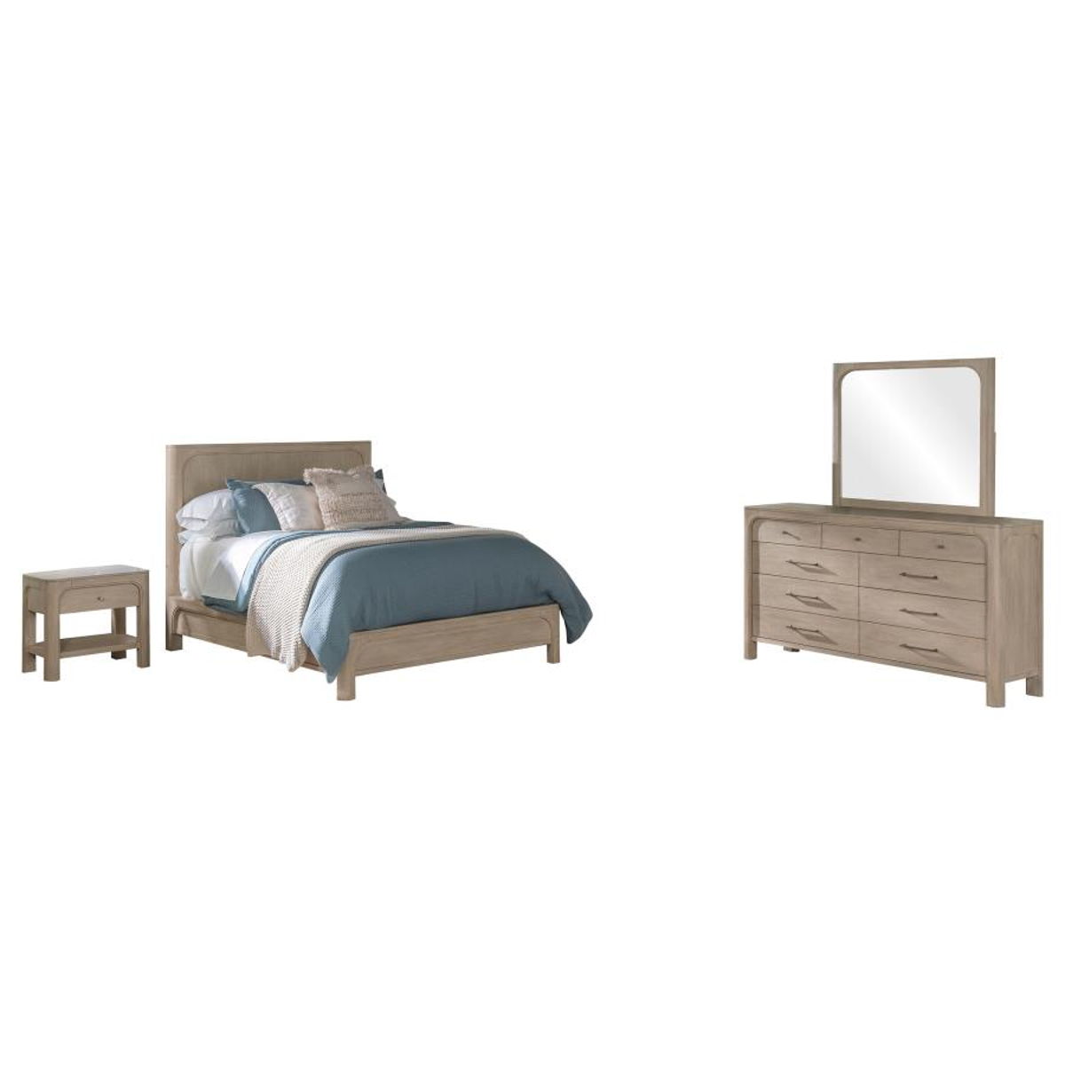 Rooted in sculptural simplicity, this bedroom set blends graceful curves with timeless structure. Softened corners and arched framing create a calming flow, while each piece offers thoughtful storage with felt-lined drawers and smooth-gliding function. Hidden compartments and integrated features bring quiet luxury. Crafted from mahogany, engineered wood, and mango veneer, the set offers enduring warmth, beauty, and refined purpose.