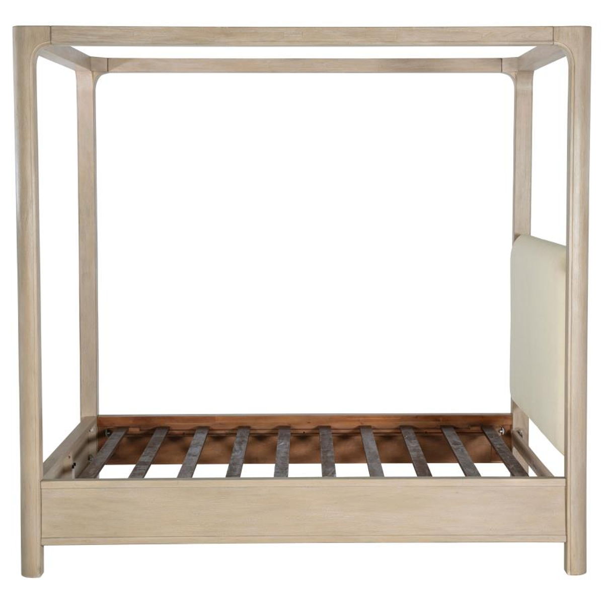 Airy and architectural, this canopy bed brings sculptural presence and soft romance to the bedroom. Gracefully arched posts frame a tall silhouette, while an upholstered headboard adds a tailored layer of texture and comfort. Designed with a platform panel base, it offers lasting support without the need for a foundation. Crafted from mahogany, engineered wood, mango veneer, and fabric, this piece blends strength and serenity in perfect harmony.