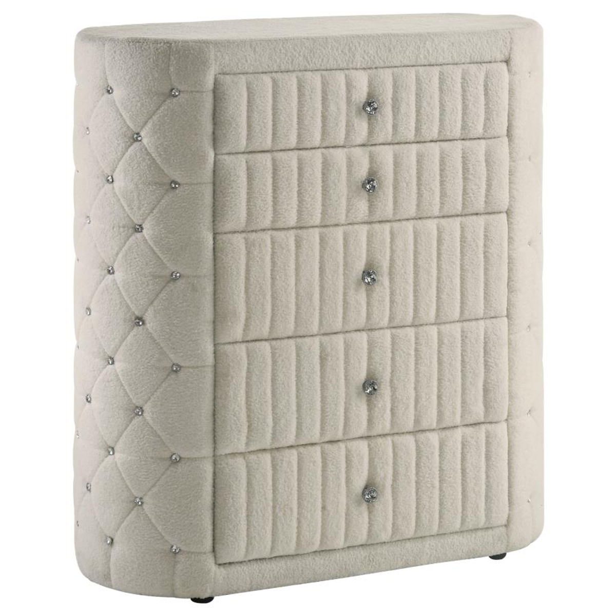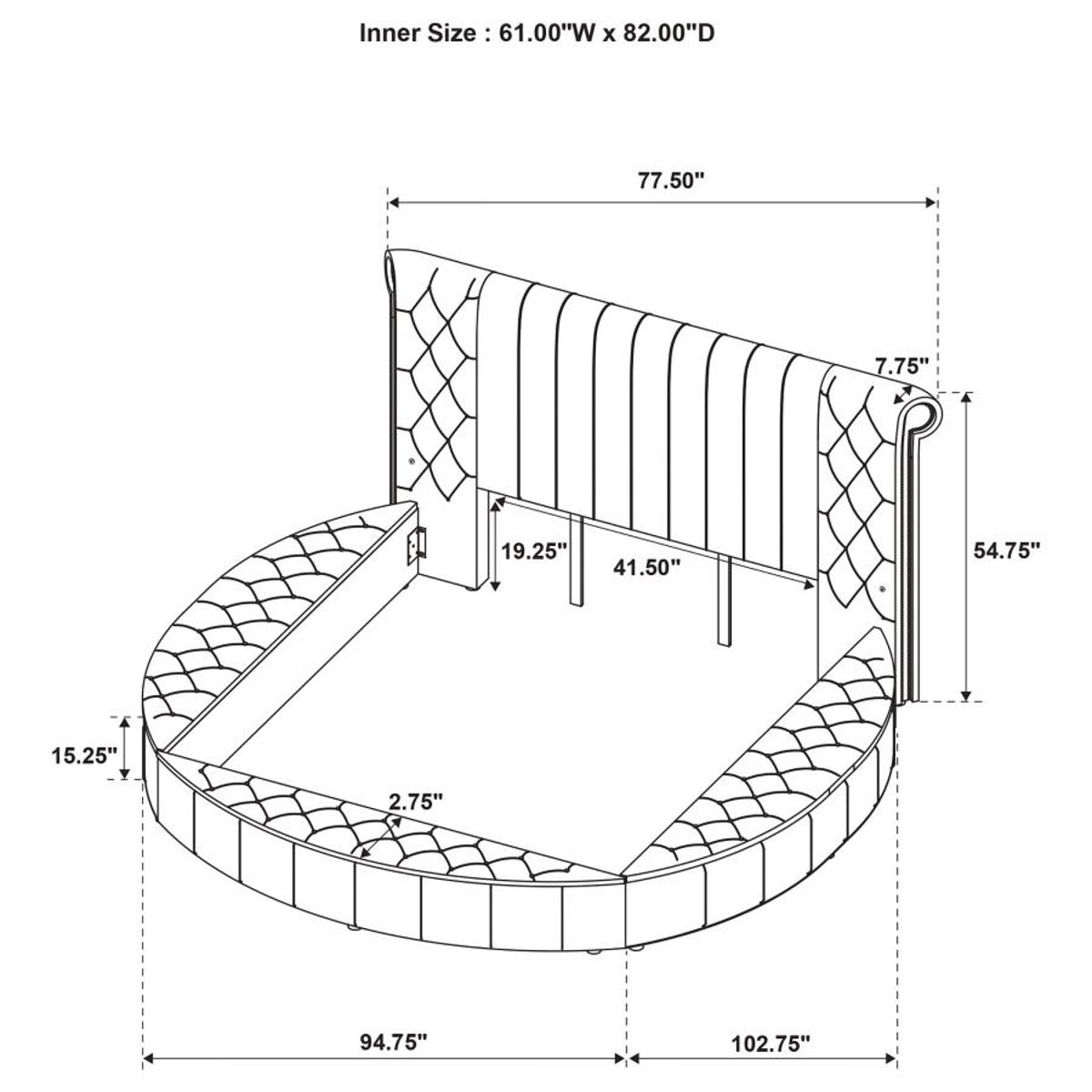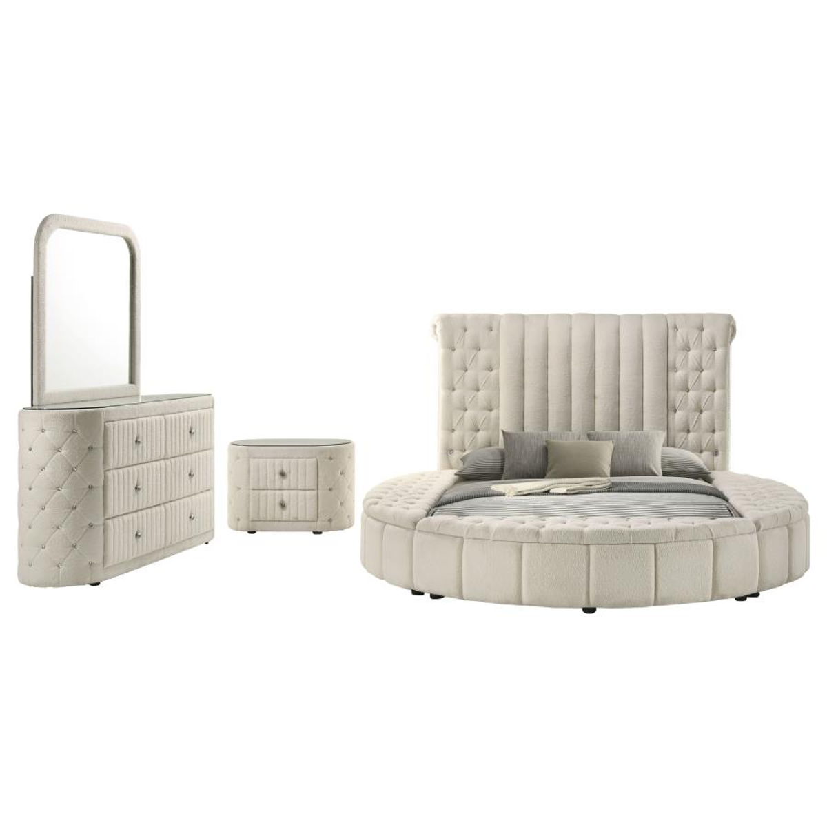 Embrace the art of retreat with a bedroom set that transforms luxury into an experience. Anchored by a grand round bed wrapped in plush velvet, the design features a sculpted scroll headboard with deep tufting and vertical channeling. Built-in USB-A and USB-C ports on both sides blend convenience into the romance, while hidden compartments beneath the upholstered base offer clever storage. Coordinating pieces mirror the softness and sparkle, with crystal hardware and sleek glass-topped silhouettes that complete the scene with quiet opulence.