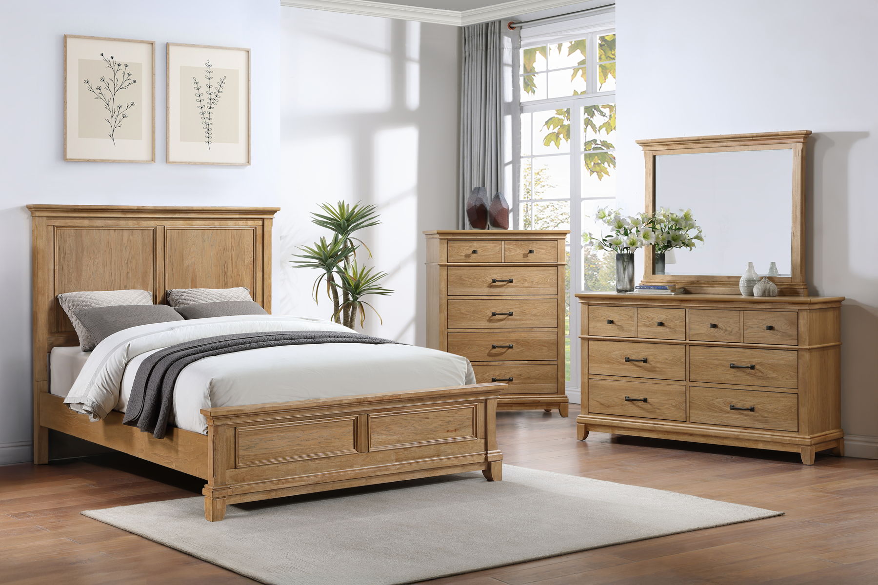 The Sunstone Wood Bedroom Set, all crafted with durable, quality construction using solid rubberwood, manufactured woods, and hickory wood veneers. This collection showcases a classic, rustic style with natural wood finishes and clean, simple lines, creating a serene and inviting atmosphere. The hand-applied stain enhances the natural grain patterns of the wood. The heirloom-quality drawers, crafted with durable dovetail joinery and three-stage steel ball glides, ensure longevity and strength, providing smooth, full-extension operation that easily supports heavy loads. The two-drawer nightstand includes a discreet hidden storage compartment, and all storage pieces feature velvet-lined top drawers for a luxurious touch. The high-quality, low-distortion mirror guarantees a clear and accurate reflection. Invest in the Sunstone set for a serene, stylish bedroom transformation that blends functionality with enduring beauty and elegance.