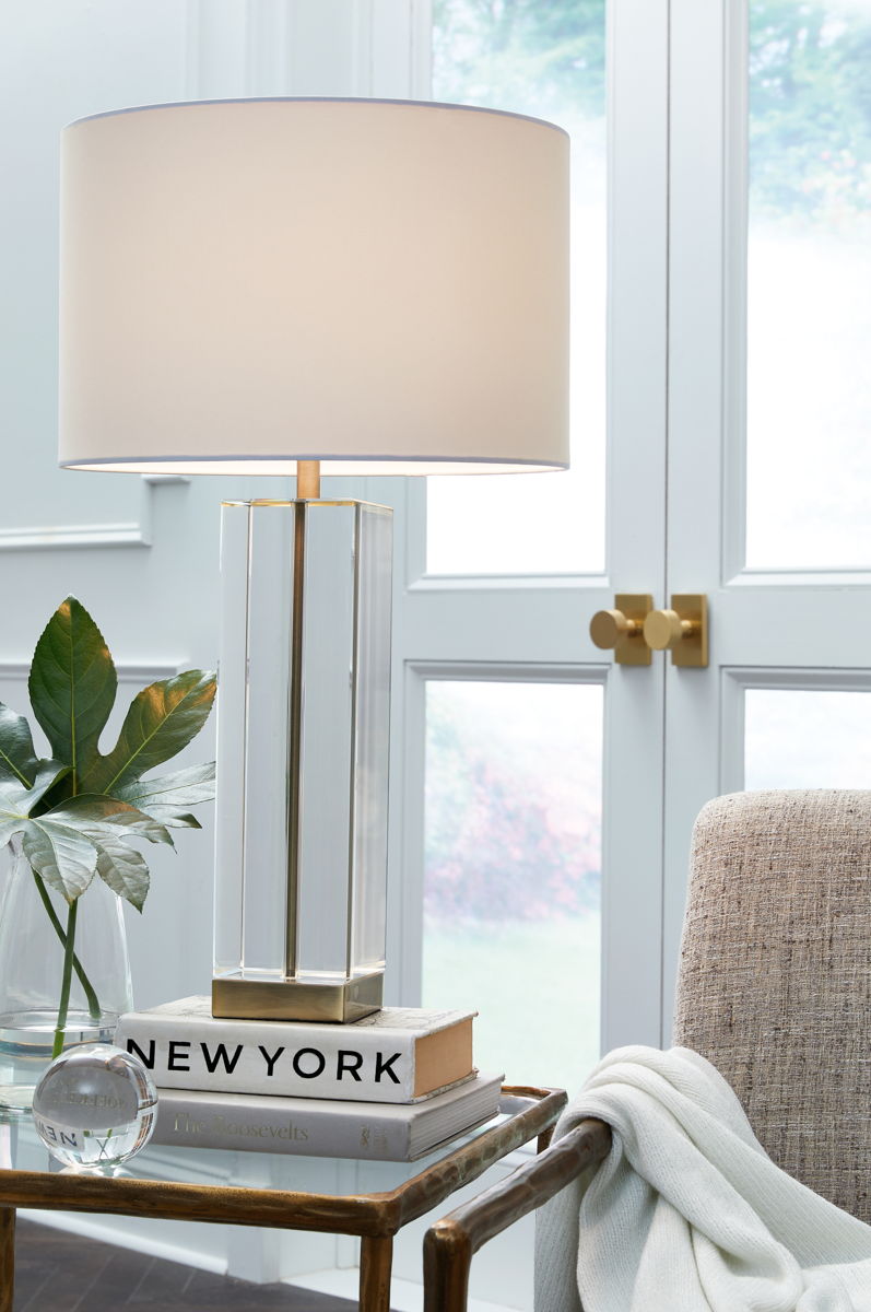 Crystal vision. A clear choice for those with a modern sensibility, this crystal table lamp masters the art of understated elegance. Touches of goldtone metal and a crisp fabric shade perfect the aesthetic.