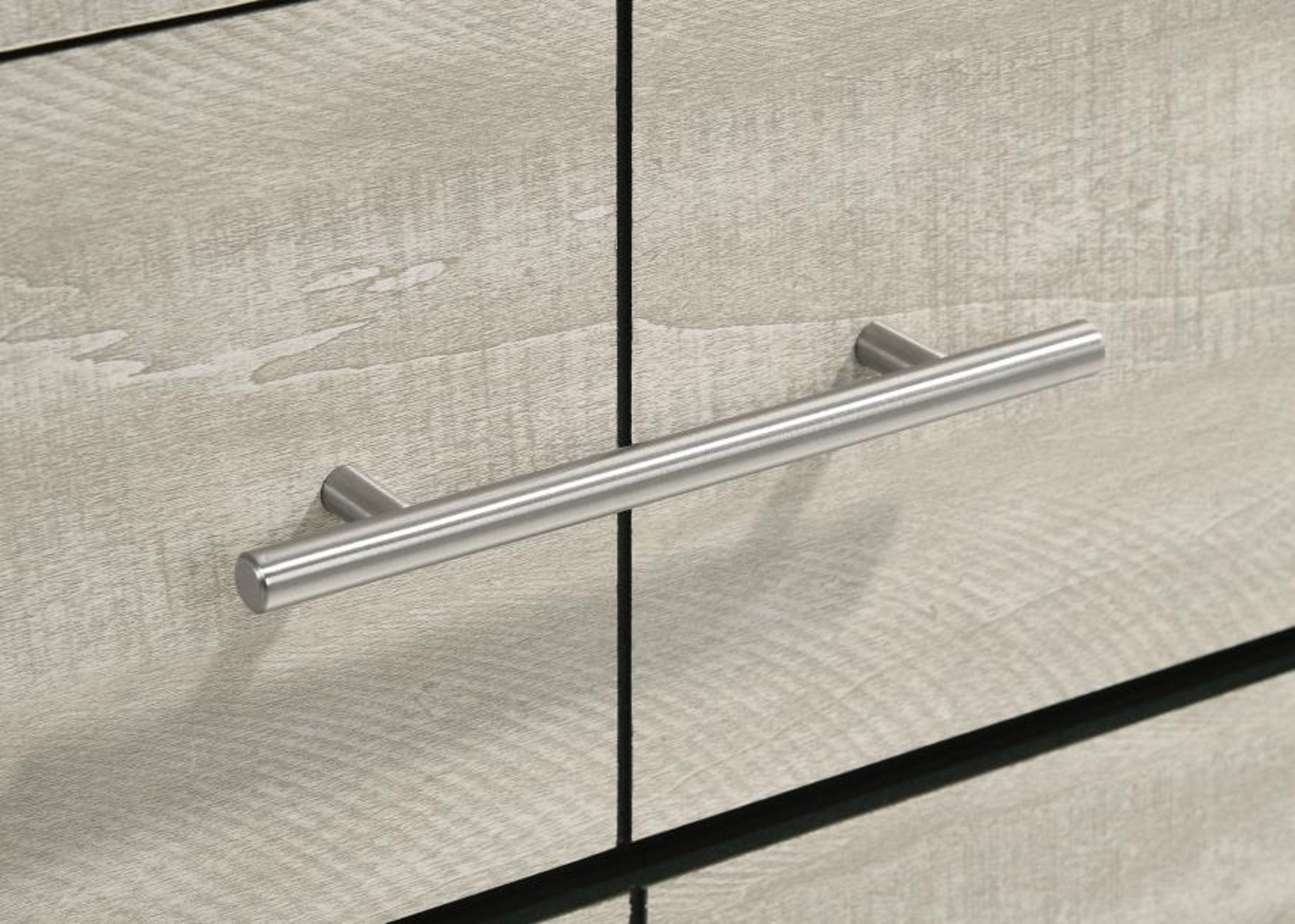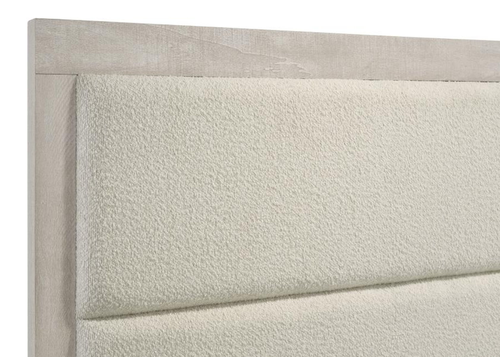 This contemporary bedroom set blends cool, modern style with rustic charm. Its Yin & Yang design pairs a rustic finish over engineered paper veneer with a sleek, floating bed. The headboard’s padded, cream bouclé fabric adds softness, while polished nickel hardware brings shine. Crafted from asian hardwood and engineered wood, drawers feature English dovetail joinery and Center metal glide for durability. This set is chic, stylish, and full of unique details.